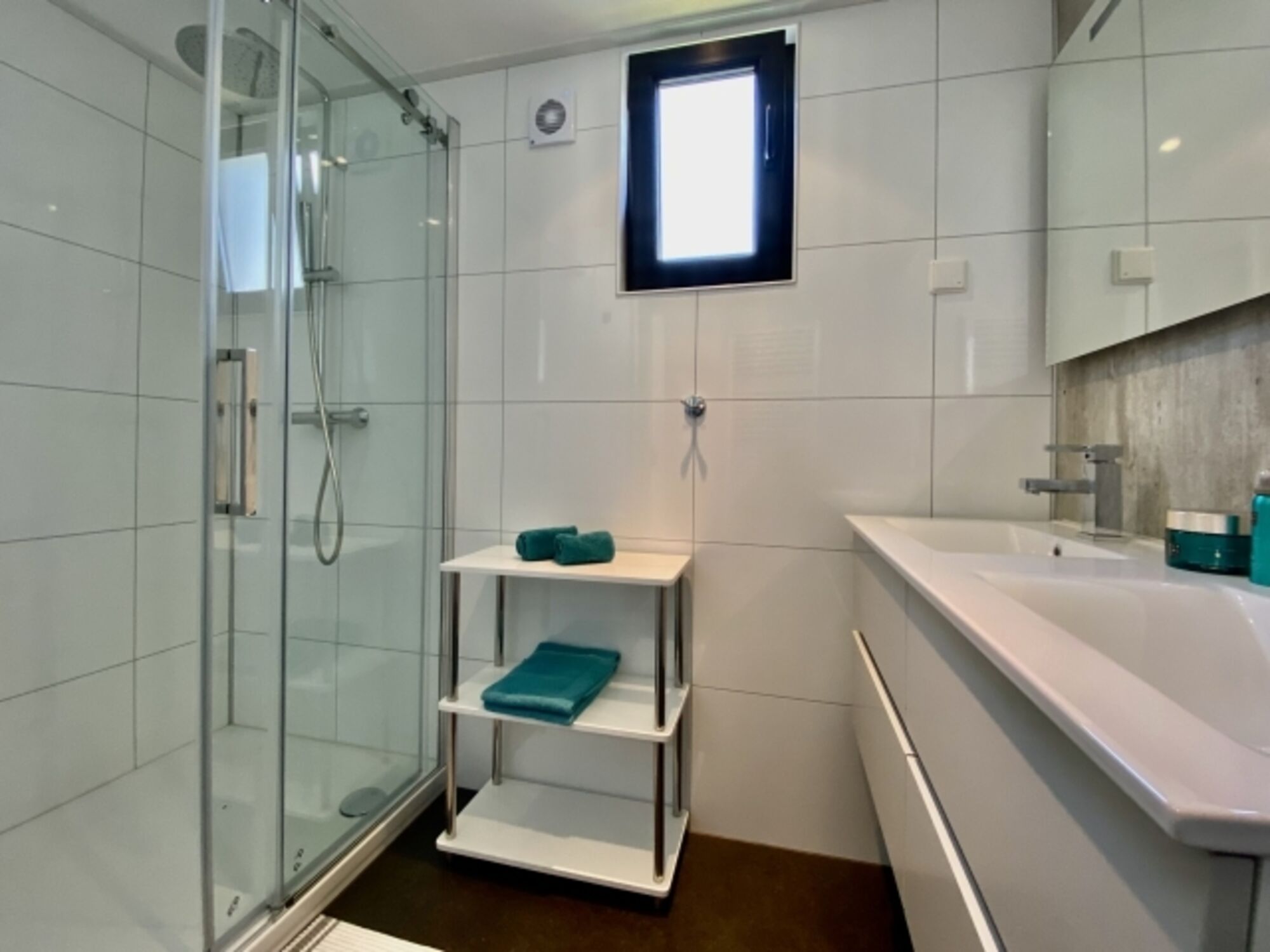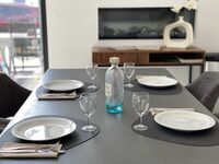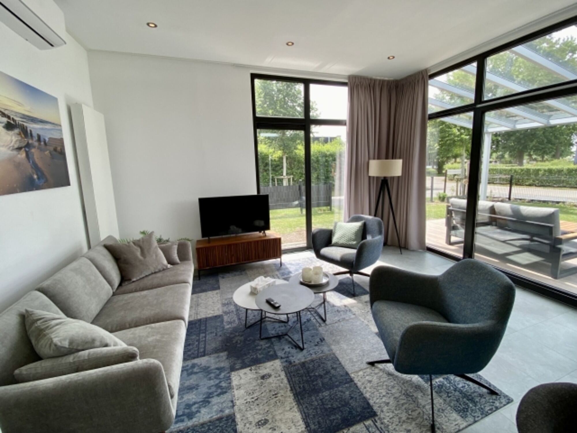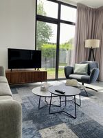 Im Wohnbereich erwartet Sie ein helles und modernes Ambiente. Bodentiefe Fenster lassen viel Tageslicht herein und schaffen eine wunderbar offene Atmosphäre, während die Klimaanlage für angenehme Kühle sorgt – auch an warmen Tagen.