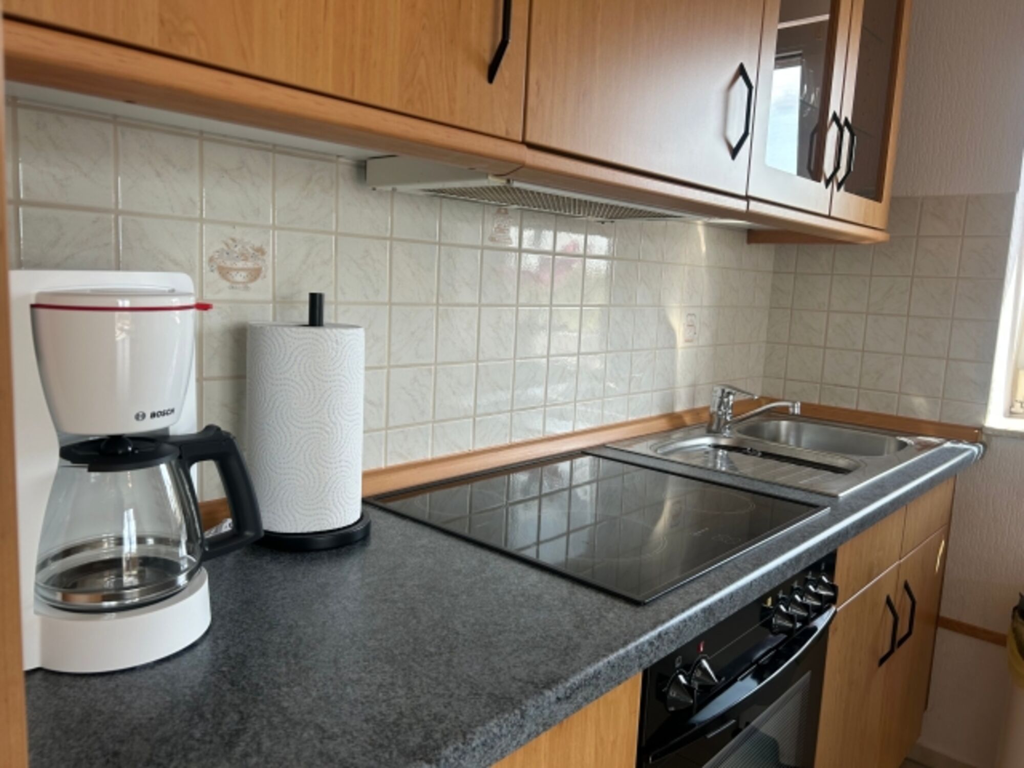 Cerankochfeld, Dunstabzugshaube, Eierkocher, Korkenzieher / Flaschenöffner, Geschirrhandtücher, Mülltüten, Essplatz in der Küche