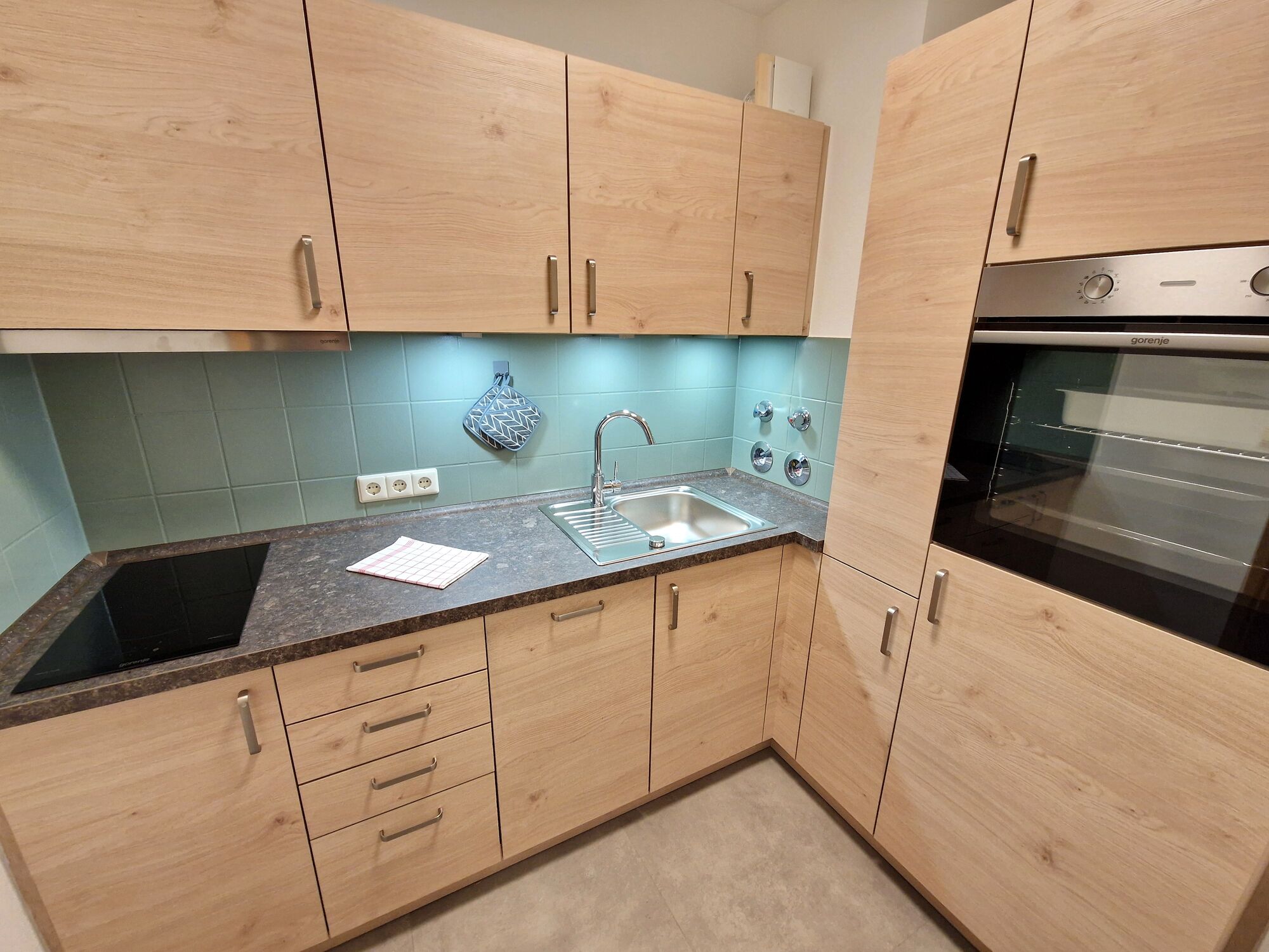 2-Platten Herd, Induktionsherd, Dunstabzugshaube, Kühlschrank mit Gefrierfach, Gewürze (Salz, Pfeffer, Zucker), Geschirrhandtücher, Mülltüten, Putzutensilien