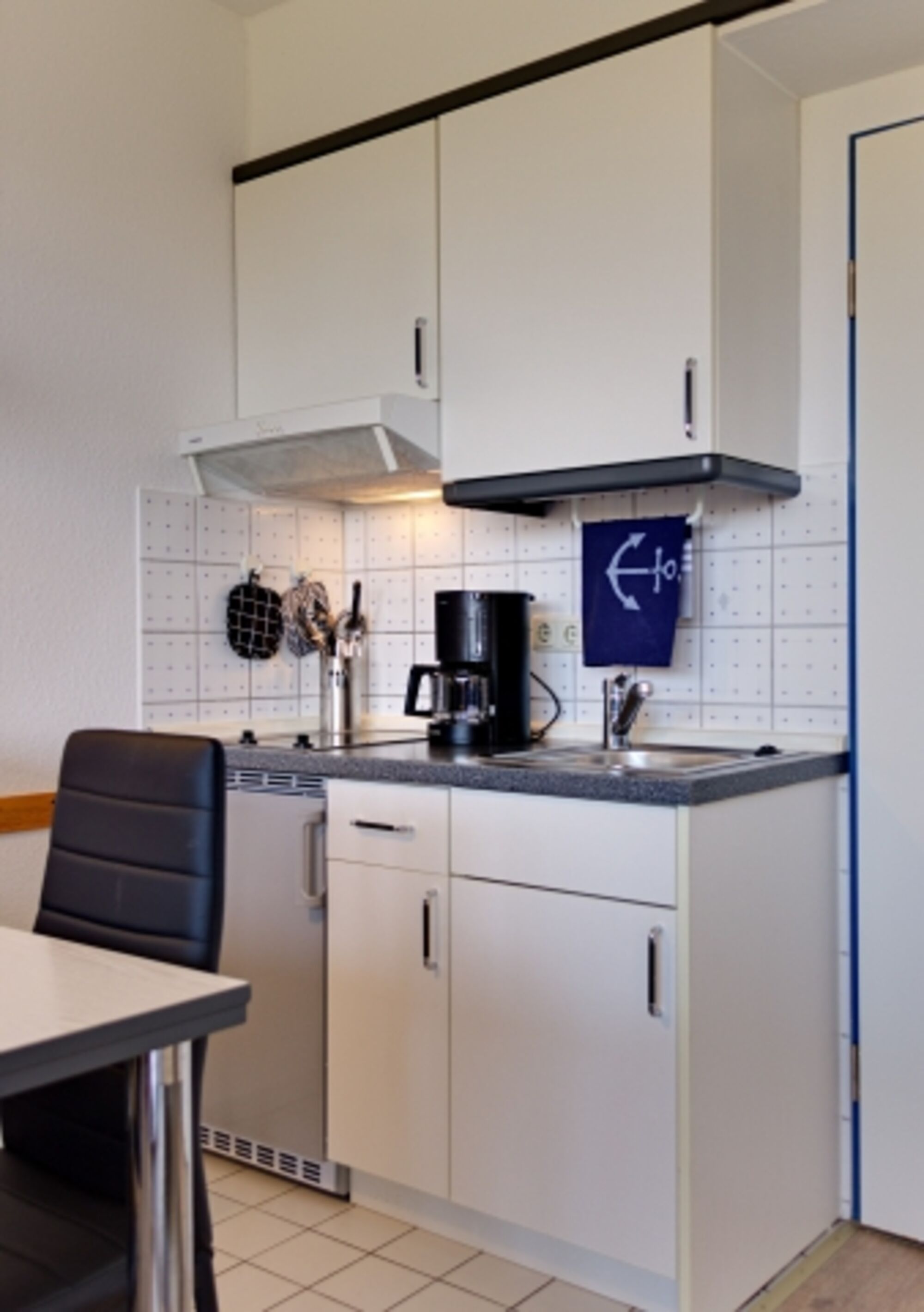 2-Platten Herd, Cerankochfeld, Dunstabzugshaube, Kühlschrank mit Gefrierfach, Korkenzieher / Flaschenöffner, Geschirrhandtücher, Essplatz in der Küche