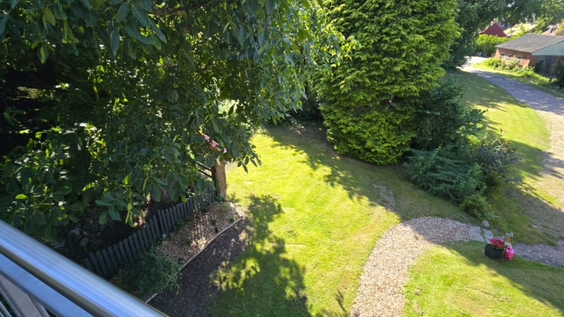 Der Außenbereich bietet eine offene Grünfläche mit Sitzmöglichkeiten im Freien.