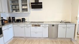 Küche: sehr große Küche / Dunstabzugshaube / Cerankochfeld / Backofen / Geschirrspüler / Kaffeevollautomat / Wasserkocher / Kühlschrank / Gefrierfach / Toaster / Esstisch mit 5 Stühlen