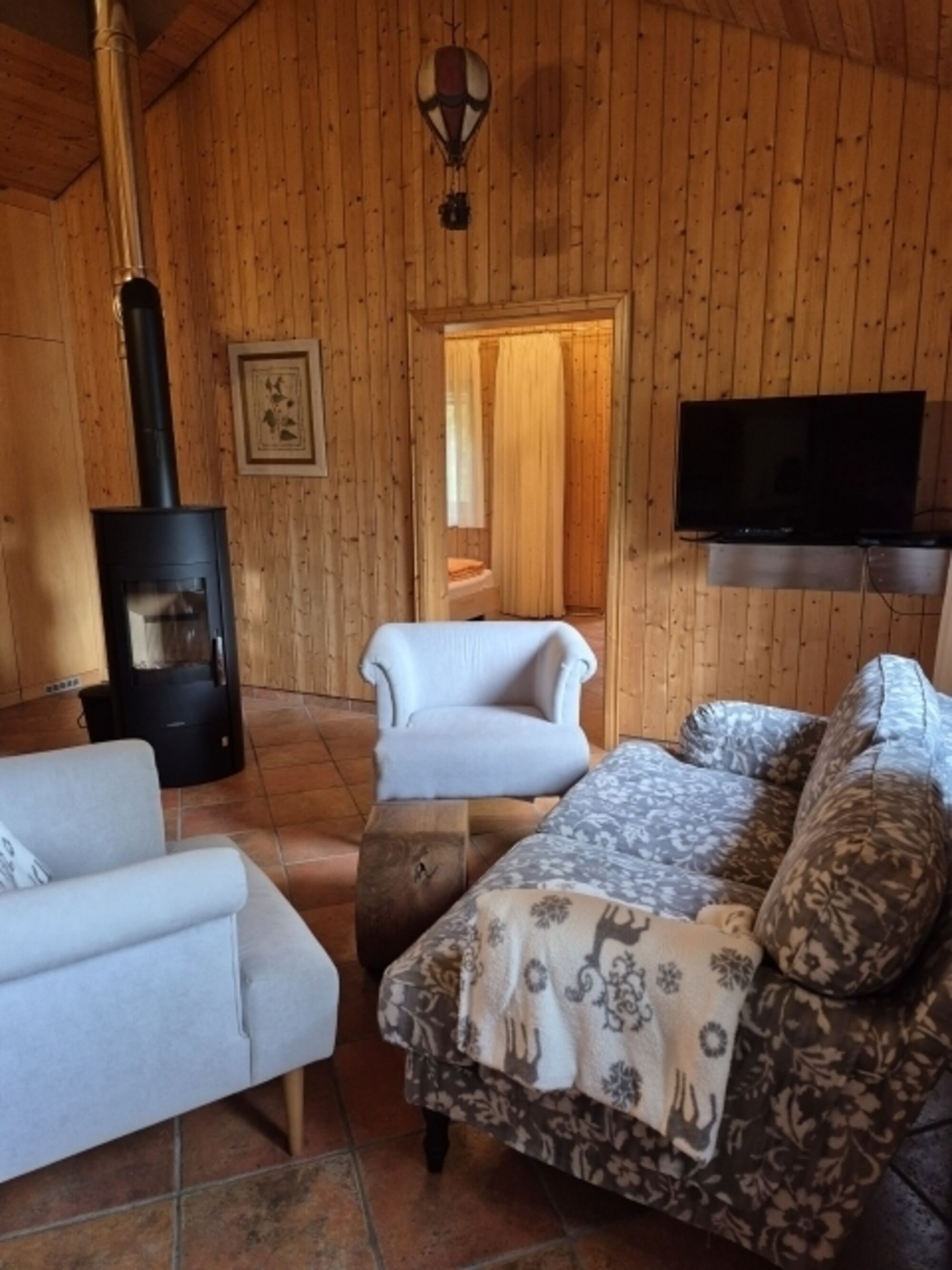 TV, Kaminofen, 2er-Sofa, Sessel, Fliegengitter