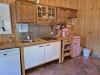 Cerankochfeld, Kühlschrank mit Gefrierfach, Senseo-Kaffeeautomat, Geschirrhandtücher, Mülltüten, Essplatz in der Küche