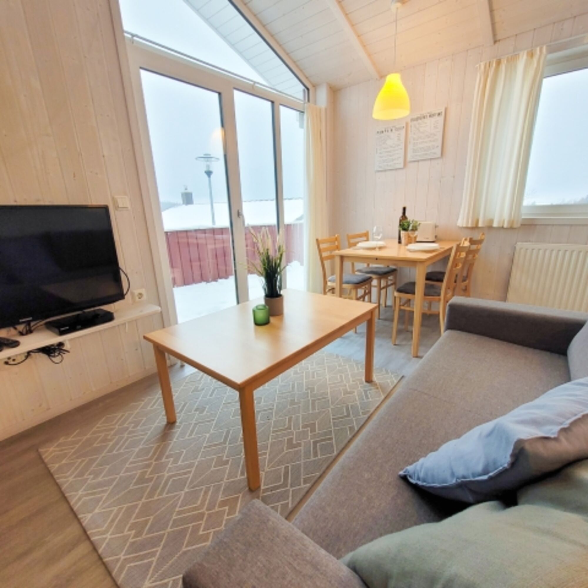 Der offene Wohnbereich ist das Herzstück des Hauses. Eine gemütliche Couch, kombiniert mit rustikalen Holzelementen und einem Bio-Ethanol-Kaminofen, sorgt für eine wohlig-warme Atmosphäre, die zu entspannten Abenden einlädt. Die großen Fenster durchfluten den Raum mit Tageslicht und bieten gleichzeitig einen herrlichen Blick auf die umliegende Natur. Ob bei einer Tasse Tee, einem spannenden Buch oder gemeinsamem Fernsehen – dieser Raum ist ideal für entspannte Stunden. Ein Flachbild-TV und eine Musikanlage stehen für zusätzliche Unterhaltung zur Verfügung.