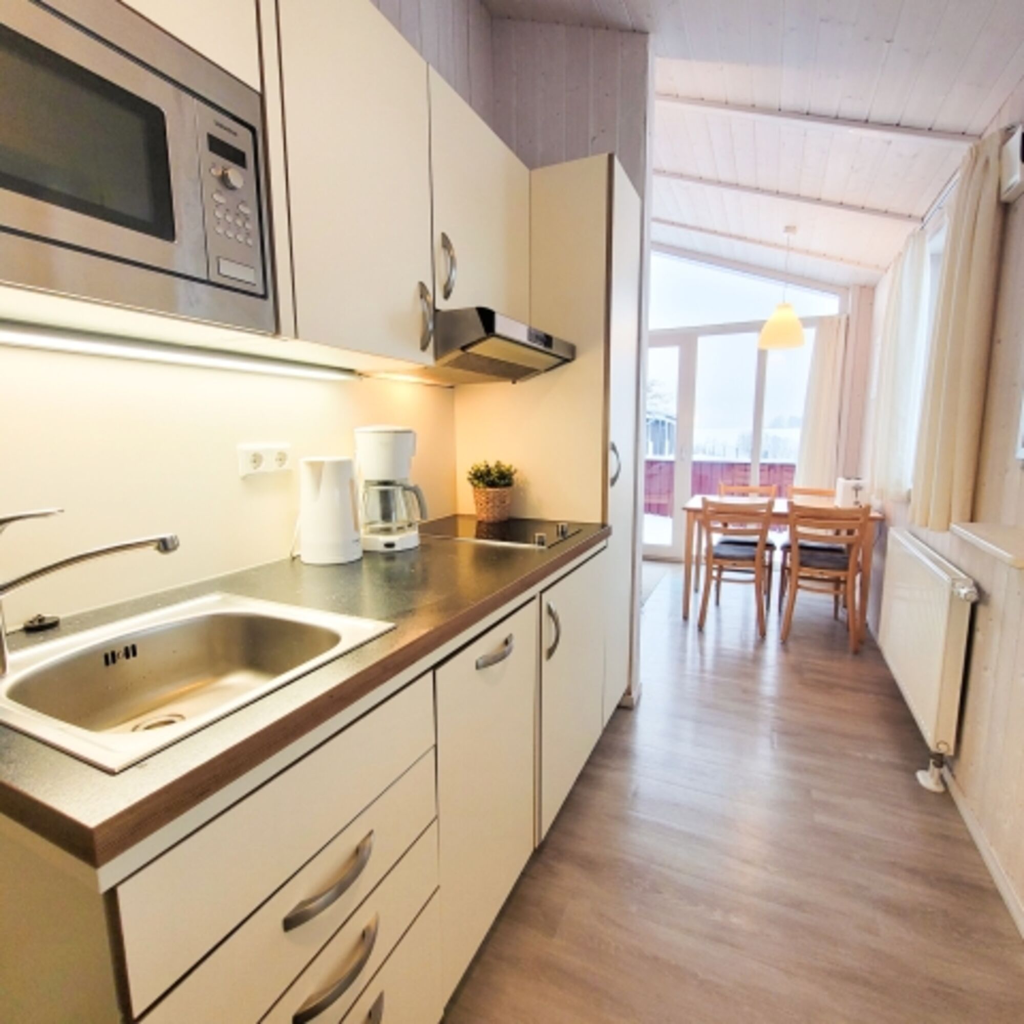 Die angrenzende, kompakte Küche ist vollständig ausgestattet und bietet alles, was Sie benötigen, um leckere Mahlzeiten zuzubereiten. Neben einem 2-Platten-Cerankochfeld stehen Ihnen ein Kühlschrank mit Gefrierfach, eine Mikrowelle und eine Kaffeemaschine zur Verfügung. Der kleine, einladende Essbereich ist perfekt, um bei gemeinsamen Mahlzeiten und langen Gesprächen die Erlebnisse des Tages Revue passieren zu lassen.
