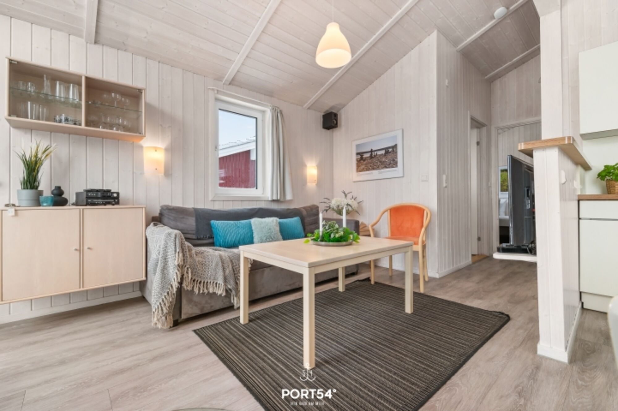 Der offene Wohnbereich ist das Herz des Hauses. Eine gemütliche Couch, rustikale Holzelemente und ein Holzofenkamin sorgen für eine behagliche Atmosphäre, die zum Entspannen einlädt. Große Fenster lassen viel Tageslicht herein und bieten einen malerischen Blick auf die umliegende Natur. Zur Unterhaltung stehen ein Flachbild-TV und eine Musikanlage bereit.