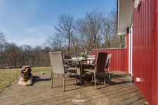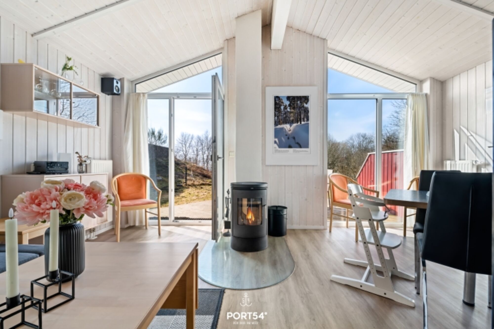 Der offene Wohnbereich ist das Herz des Hauses. Eine gemütliche Couch, rustikale Holzelemente und ein Holzofenkamin sorgen für eine behagliche Atmosphäre, die zum Entspannen einlädt. Große Fenster lassen viel Tageslicht herein und bieten einen malerischen Blick auf die umliegende Natur. Zur Unterhaltung stehen ein Flachbild-TV und eine Musikanlage bereit.