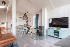 Der offene Wohnbereich bildet das Herzstück des Hauses. Eine gemütliche Couch, skandinavisches Desigt mit klaren Linien und ein Holzofenkamin sorgen für eine behagliche Atmosphäre, die zum Entspannen und Verweilen einlädt. Die großen Fenster bieten einen atemberaubenden Blick auf die umgebende Natur und lassen viel Tageslicht in den Raum. Zur Unterhaltung stehen insgesamt 4 TV-Geräte sowie eine Musikanlage zur Verfügung, sodass für alle Gäste stets für Unterhaltung gesorgt ist.