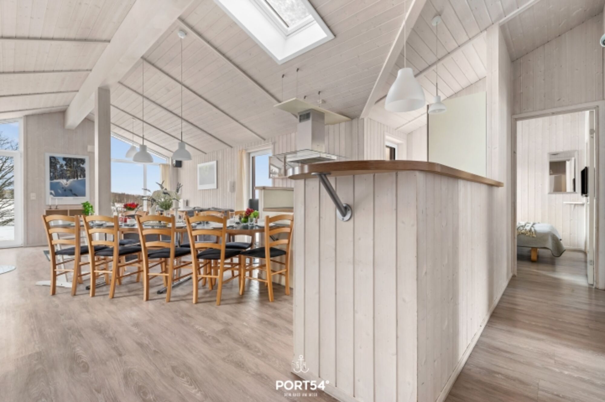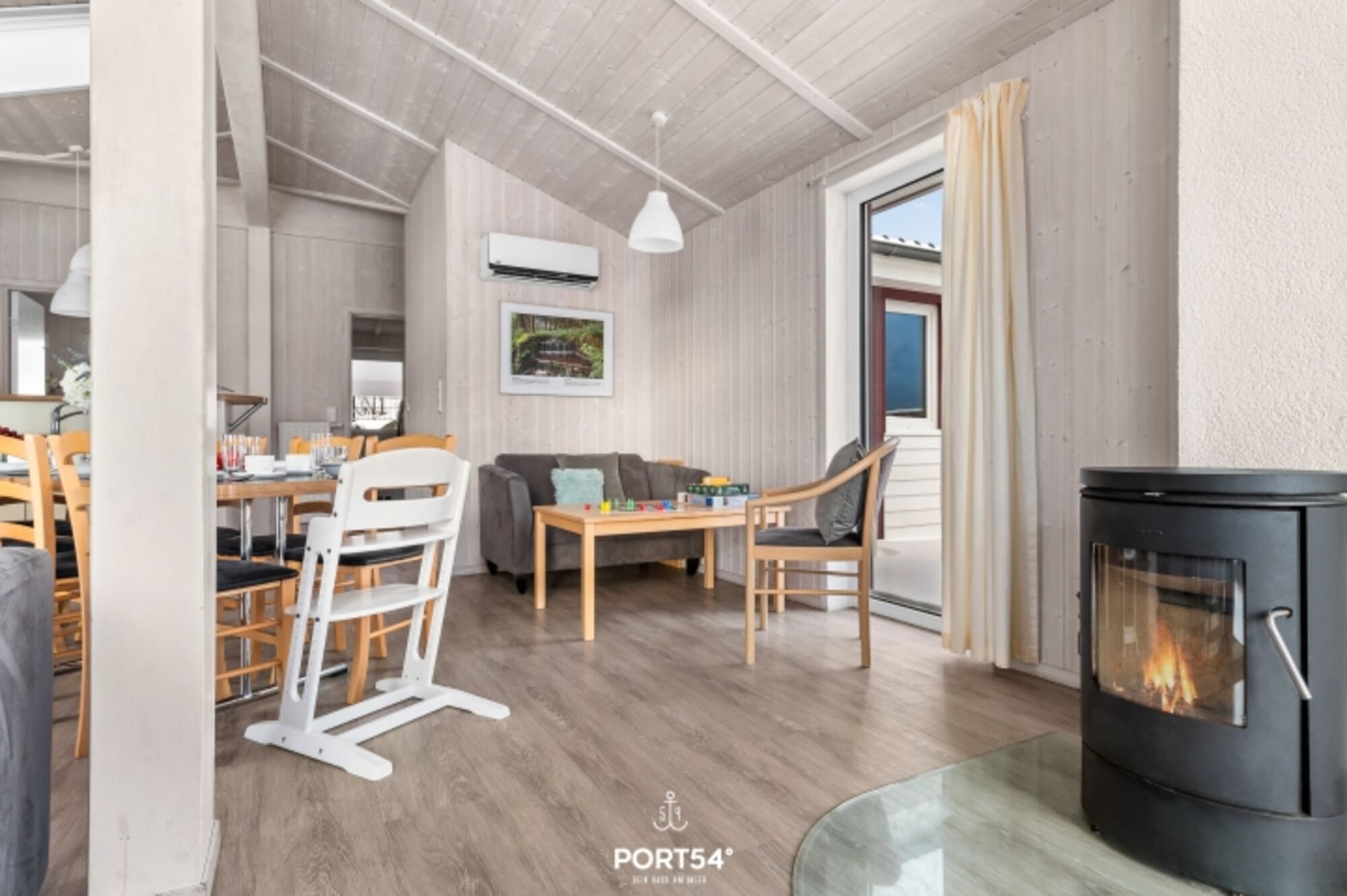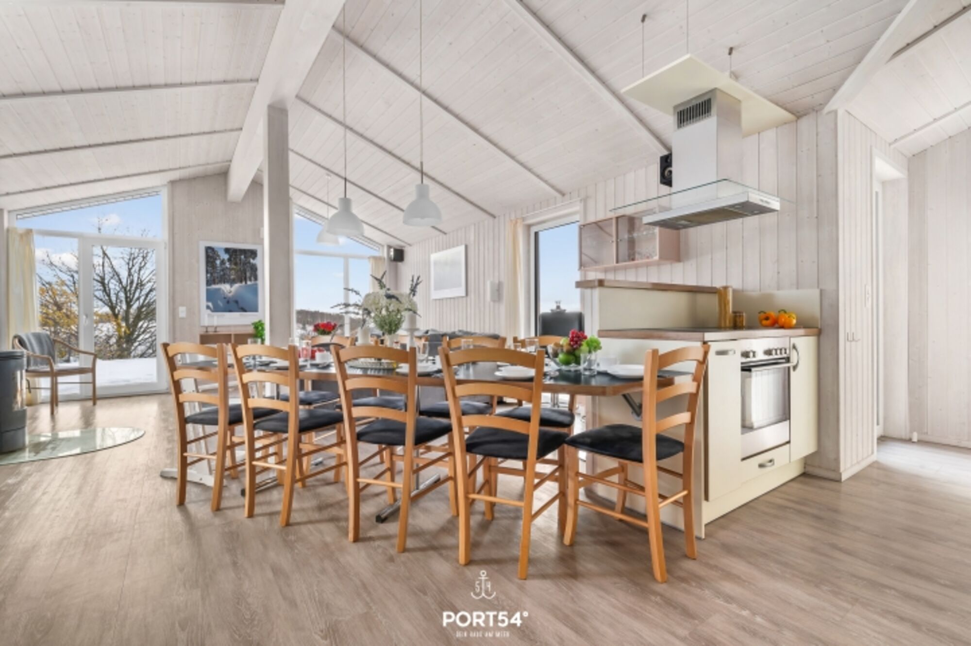 Der offene Wohnbereich bildet das Herzstück des Hauses. Eine gemütliche Couch, skandinavisches Desigt mit klaren Linien und ein Holzofenkamin sorgen für eine behagliche Atmosphäre, die zum Entspannen und Verweilen einlädt. Die großen Fenster bieten einen atemberaubenden Blick auf die umgebende Natur und lassen viel Tageslicht in den Raum. Zur Unterhaltung stehen insgesamt 4 TV-Geräte sowie eine Musikanlage zur Verfügung, sodass für alle Gäste stets für Unterhaltung gesorgt ist.