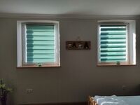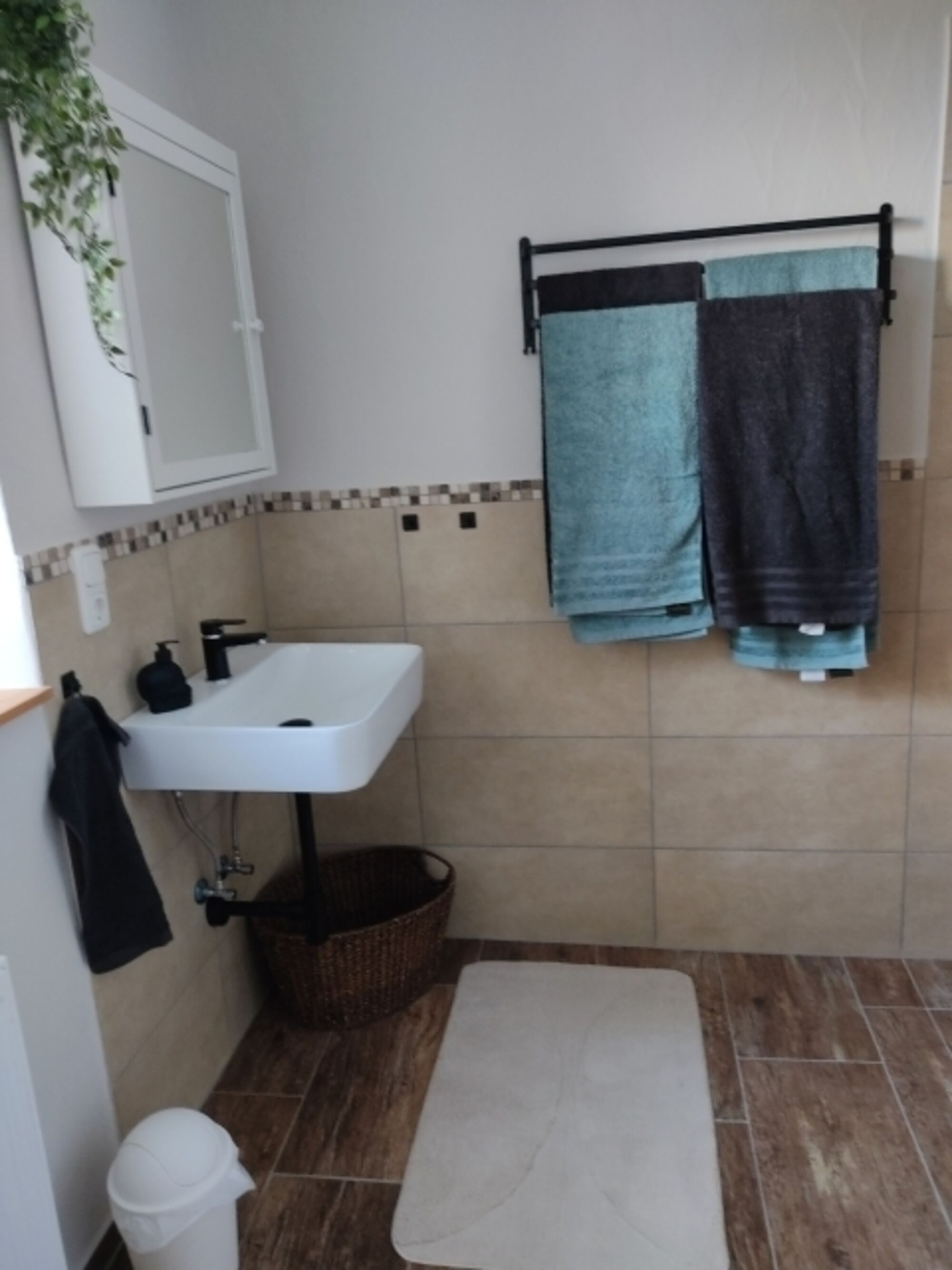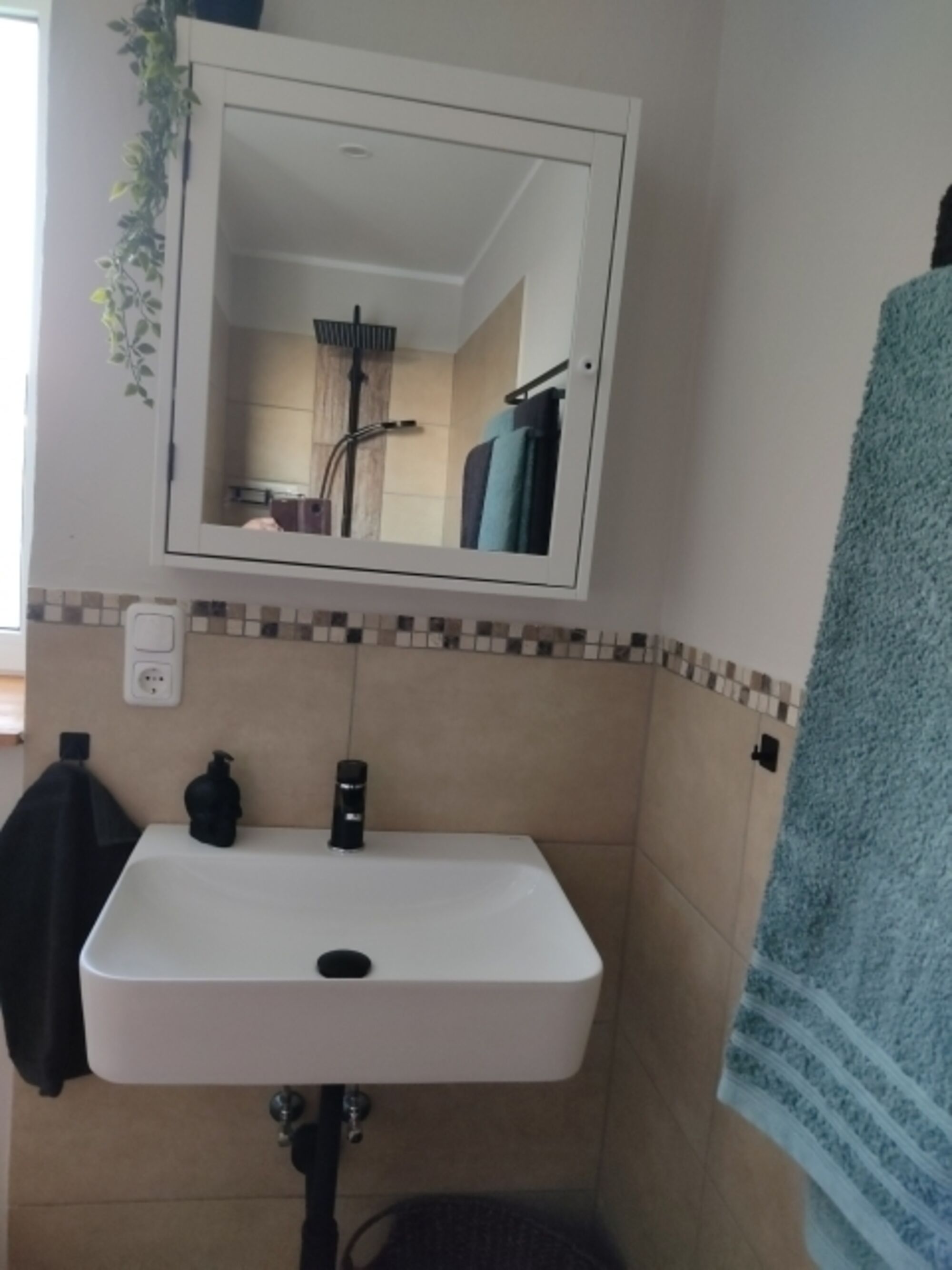 Waschbecken, Massagedusche, Regendusche, Kosmetiktücher, Spiegel, Fenster im Bad, Fliegengitter