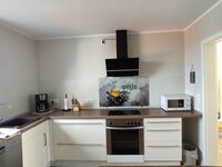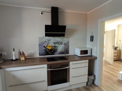 4-Platten Herd, Cerankochfeld, Dunstabzugshaube, Mixer, Waffeleisen, Korkenzieher / Flaschenöffner, Gewürze (Salz, Pfeffer, Zucker), Öl / Essig, Geschirrhandtücher, Mülltüten, Essplatz in der Küche