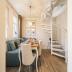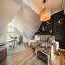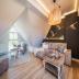 Über eine elegante Wendeltreppe gelangen Sie in den oberen Bereich der Wohnung, wo sich der helle und geräumige Wohnbereich befindet. Hier sorgt eine Aufbettung auf der bequemen Couch für zusätzliche Schlafplätze, die Flexibilität für größere Gruppen ermöglicht.