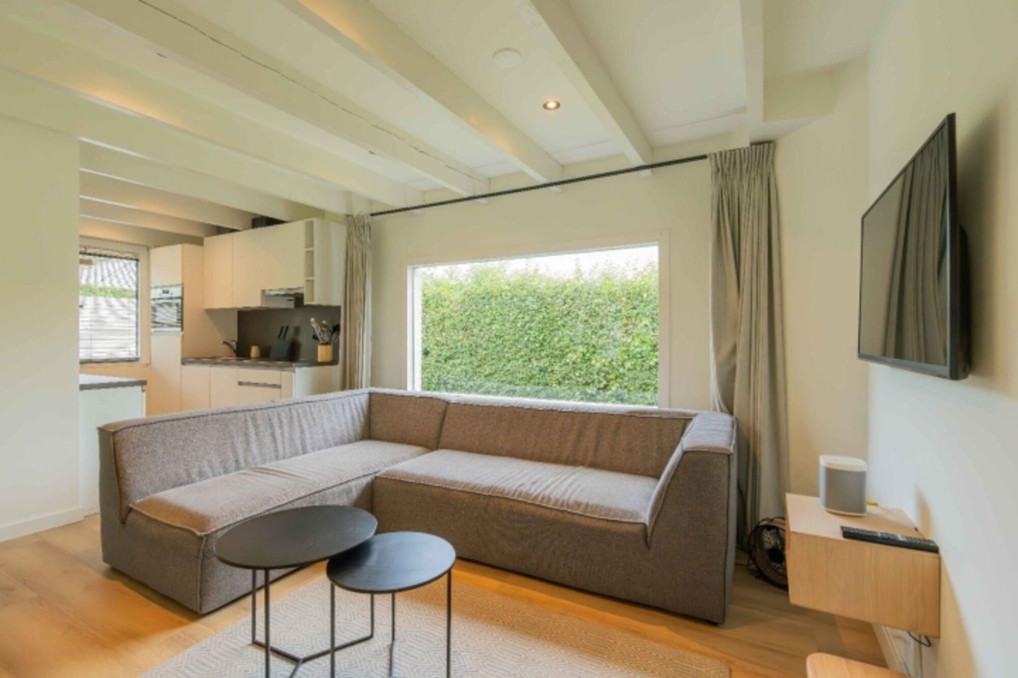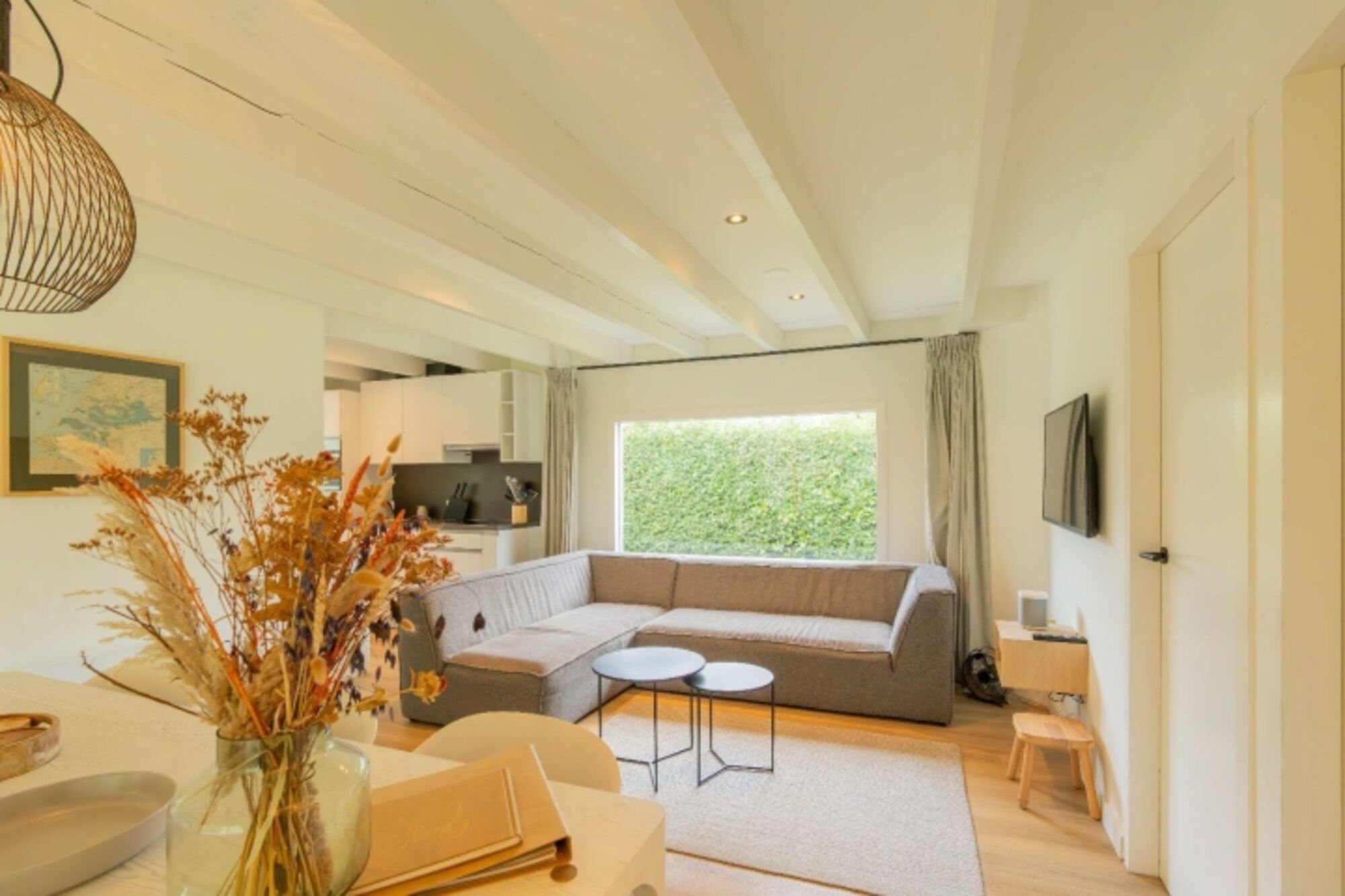 Innen erwartet Sie eine warme, moderne Atmosphäre mit stilvoller Einrichtung und durchdachten Annehmlichkeiten. Im gemütlichen Wohnzimmer können Sie auf dem Ecksofa entspannen – mit digitalem Fernsehen inklusive Netflix (über Ihren eigenen Account). Der angrenzende Essbereich bietet Platz für sechs Personen.