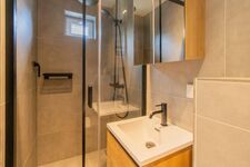 Ein modernes Badezimmer mit Regendusche, WC und Waschtisch rundet das Angebot ab.