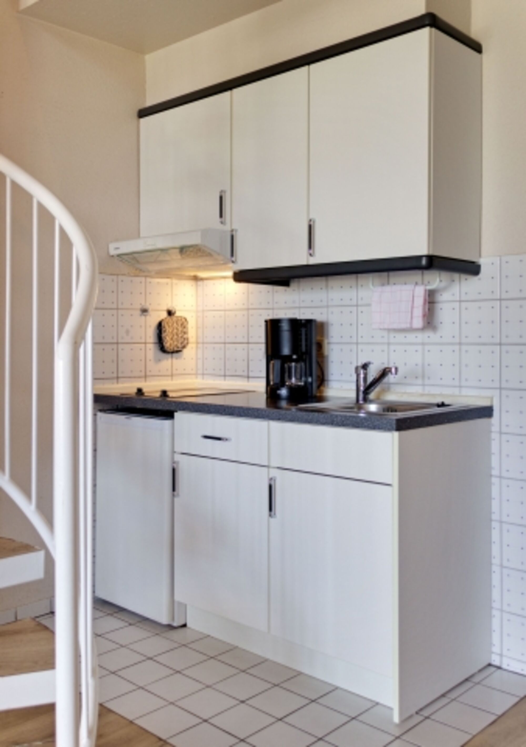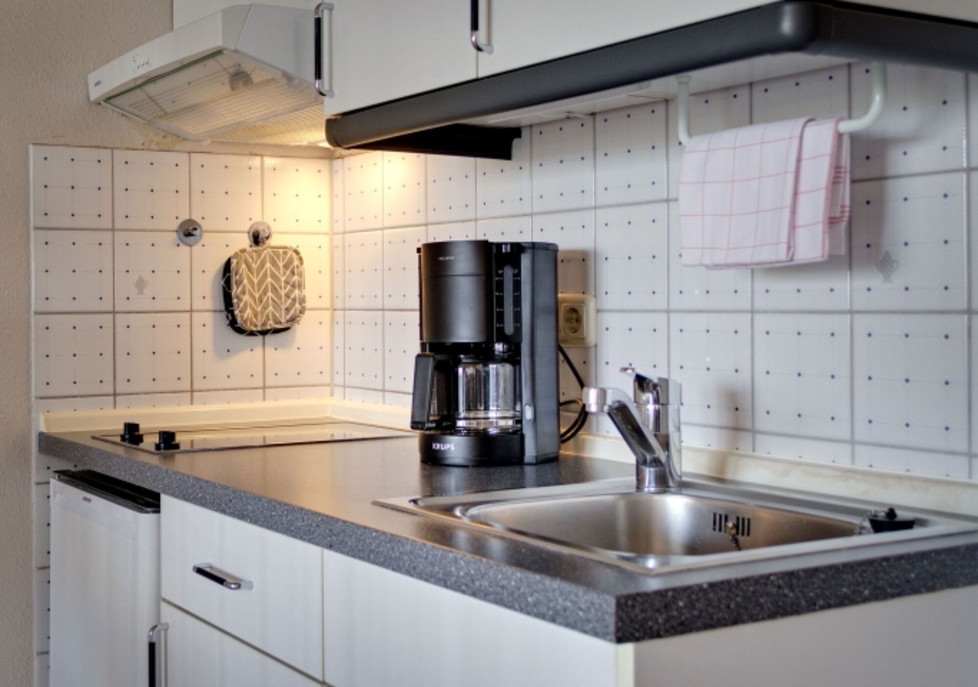 2-Platten Herd, Cerankochfeld, Dunstabzugshaube, Kühlschrank mit Gefrierfach, Korkenzieher / Flaschenöffner, Geschirrhandtücher, Essplatz in der Küche