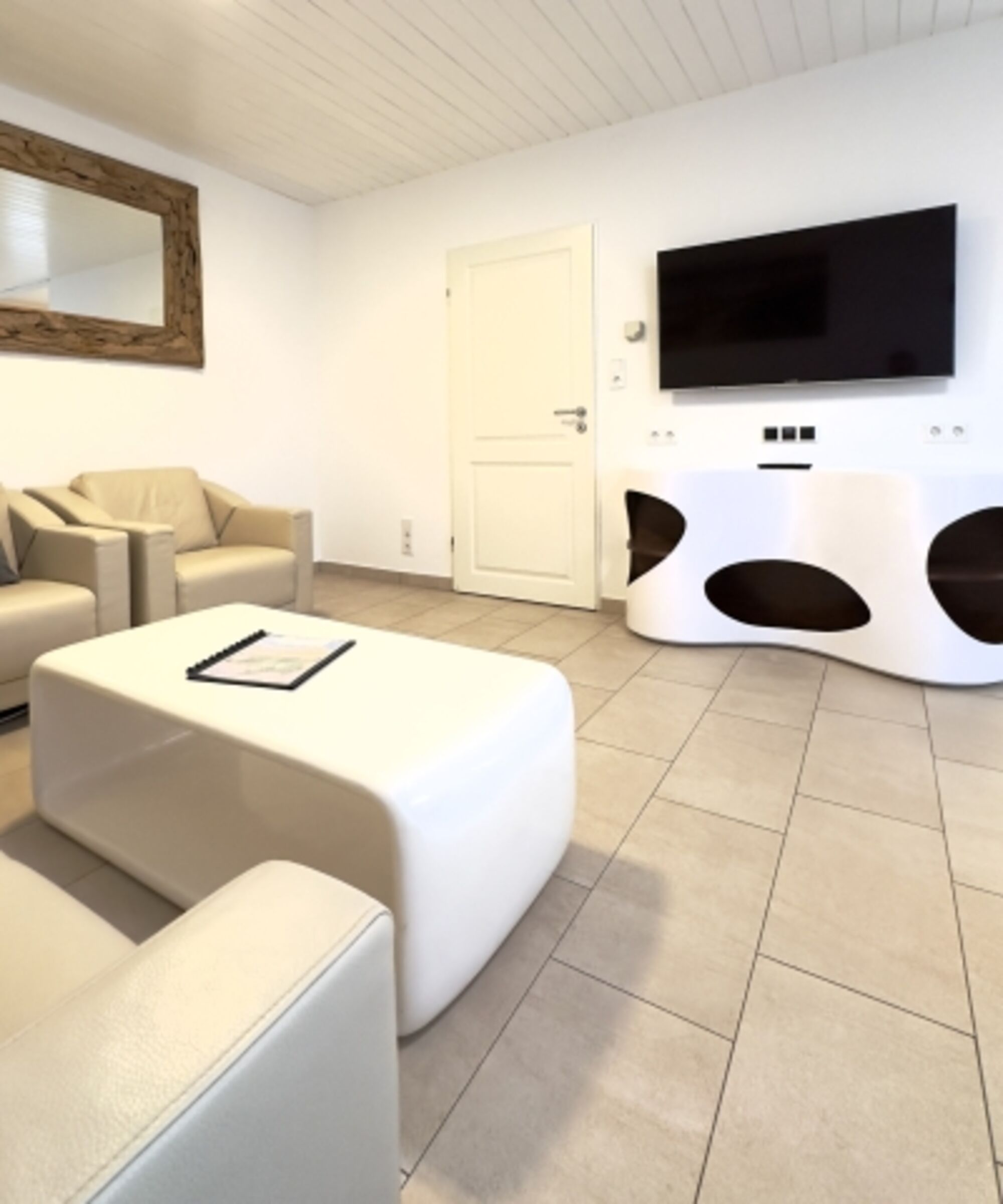 - modernes, helles Wohnzimmer mit ROLF BENZ Ledersofa in Creme