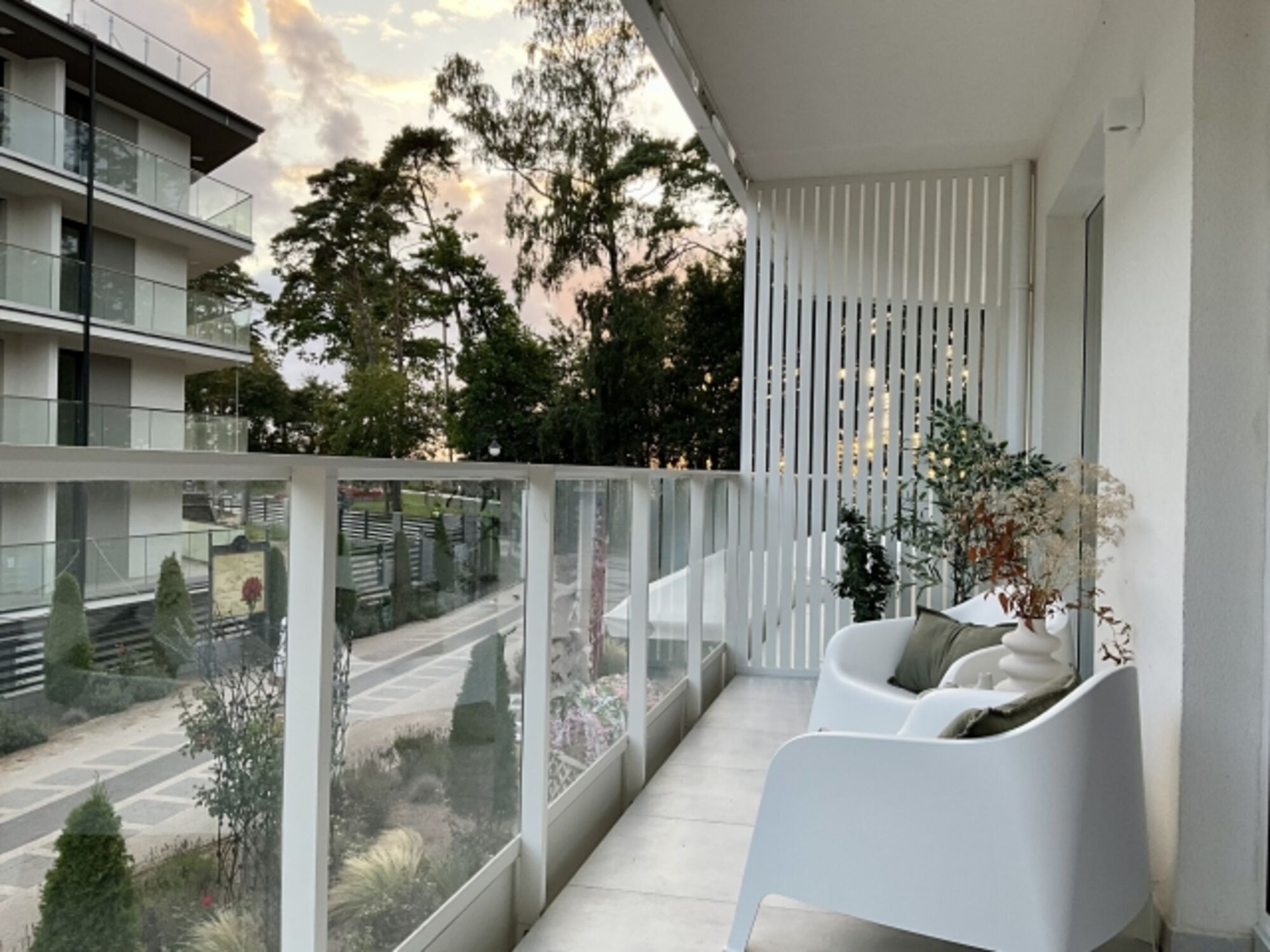 Ein besonderes Highlight ist der private, möblierte Balkon, der sowohl vom Wohn- als auch vom Schlafzimmer zugänglich ist. Starten Sie hier mit einer Tasse Kaffee in den Tag oder lassen Sie den Abend bei einem Glas Wein mit Blick auf die Küstenatmosphäre ausklingen.