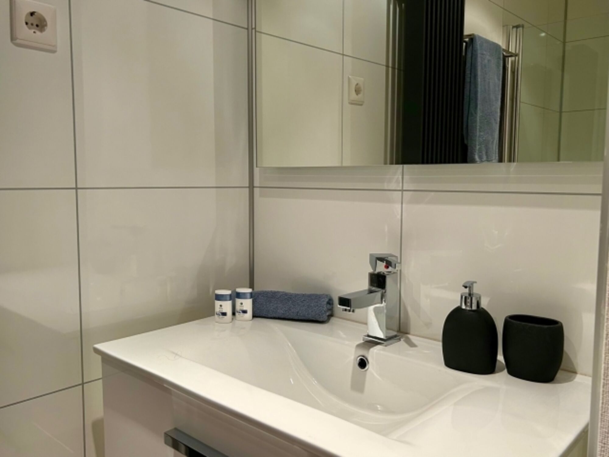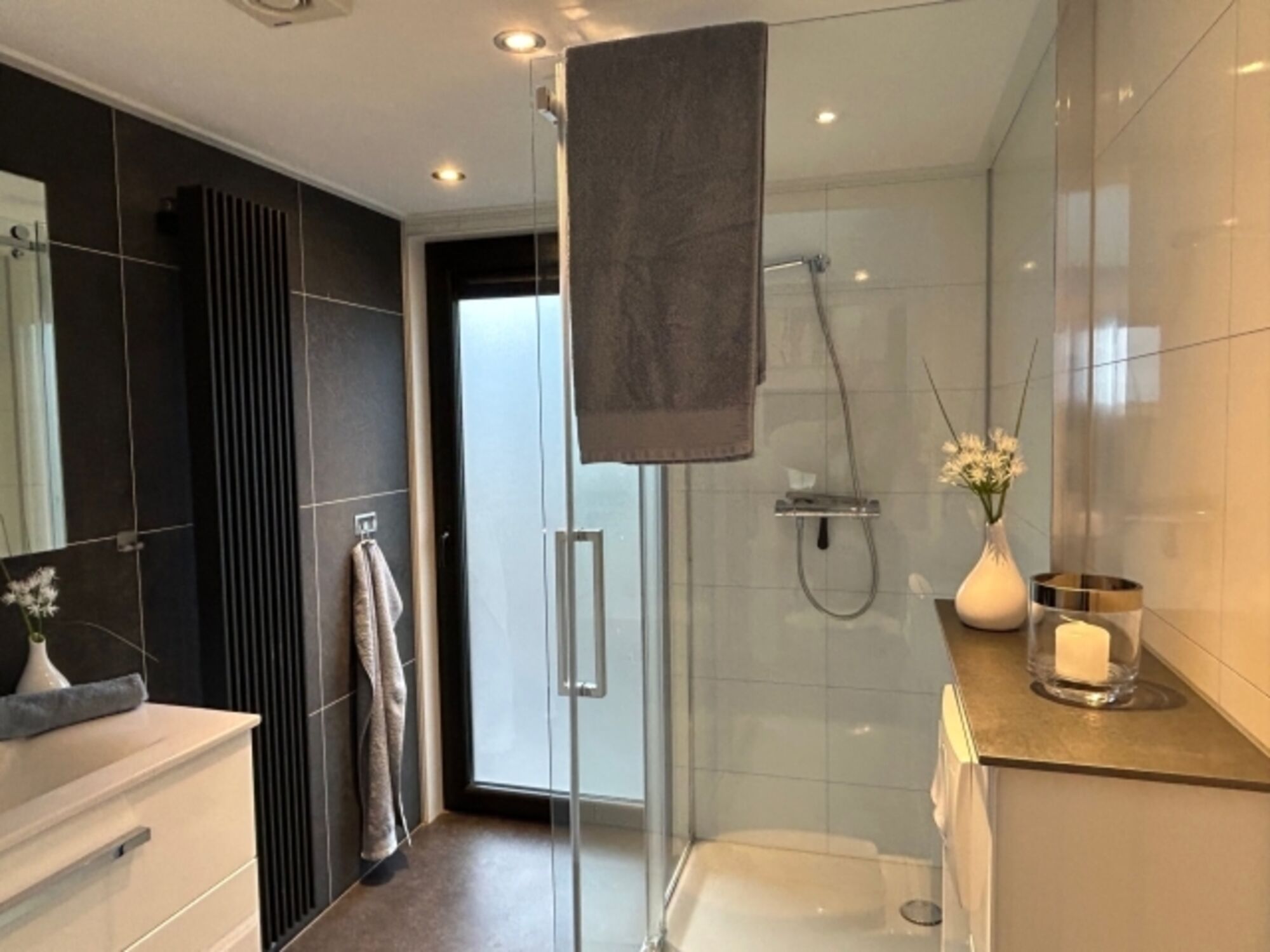 Das Bad mit Dusche und WC im Erdgeschoss ist von allen Räumen aus erreichbar.