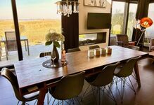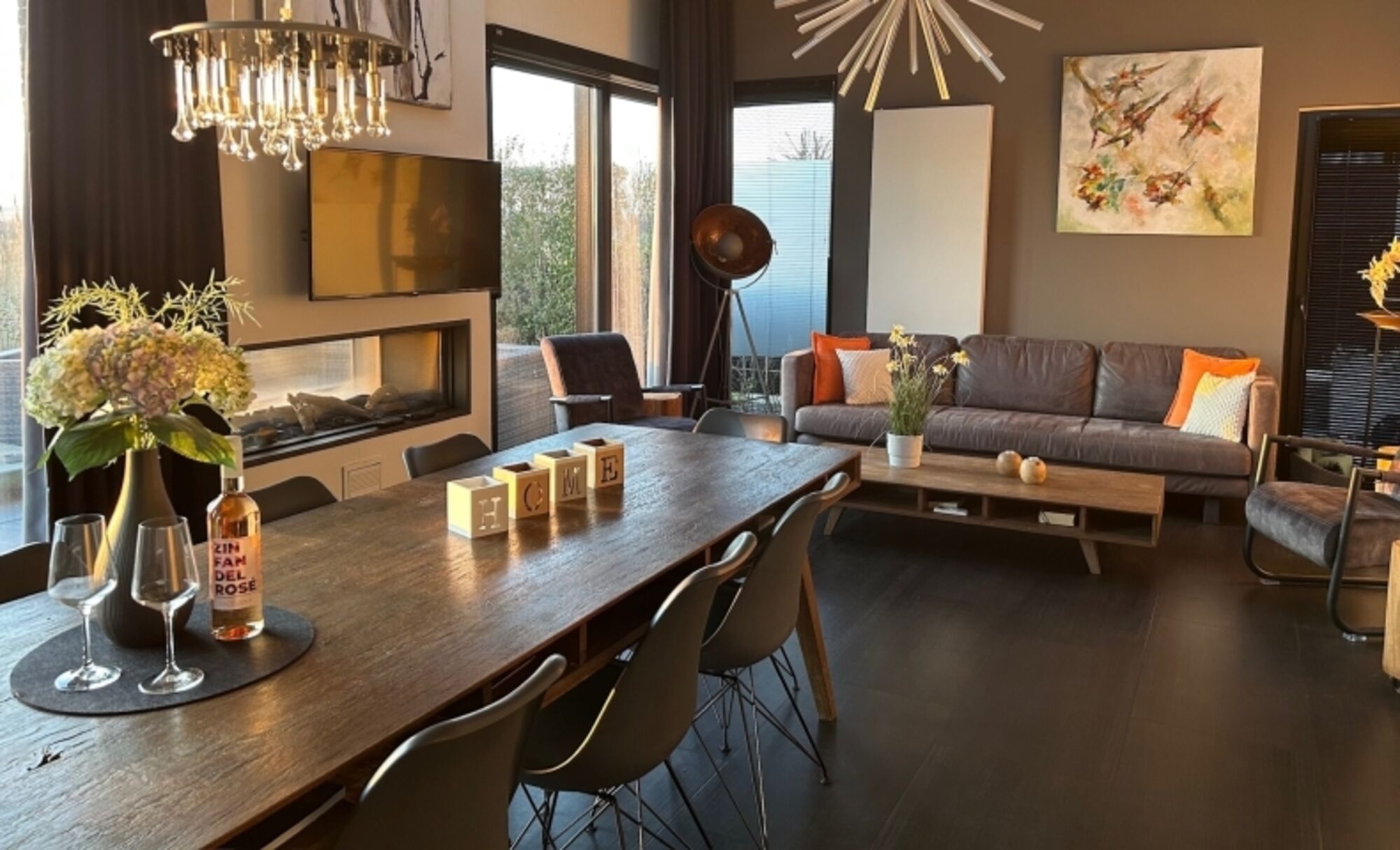 Das Chalet besteht aus einem großzügigen, offenen Wohn- und Essbereich mit Gaskamin. Von dort haben Sie einen unverbauten Blick auf das Naturschutzgebiet und den Deich.