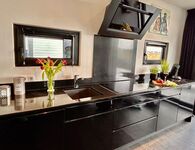 Die luxuriöse Küchenzeile ist ausgestattet mit einer separaten Mikrowellen-, Backofenkombination, die auch die Kühl-und Gefrierkombination sowie separate Geschirrschränke und Fächer enthält, einem hochwertigen Elektroherd mit Ceranfeld, einer Geschirrspülmaschine, weiteren Schränken sowie einer Filterkaffee-, Senseo und einer Nespressomaschine, Geschirr, Gläsern, Schüsseln und Töpfen. Der große Esstisch mit Platz für 8 Personen lädt zum gemütlichen Beisammensein ein.
