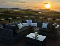 Die Dachterrasse verfügt über einen gemütlichen Loungebereich, zwei Liegen sowie einem großen Sonnenschirm. Von dort lässt sich ungestört die Tier- und Pflanzenwelt im Naturschutzgebiet beobachten. Ein Highlight sind die wunderschönen Sonnenuntergänge über den Waterdunen oder dem Leuchtturm.