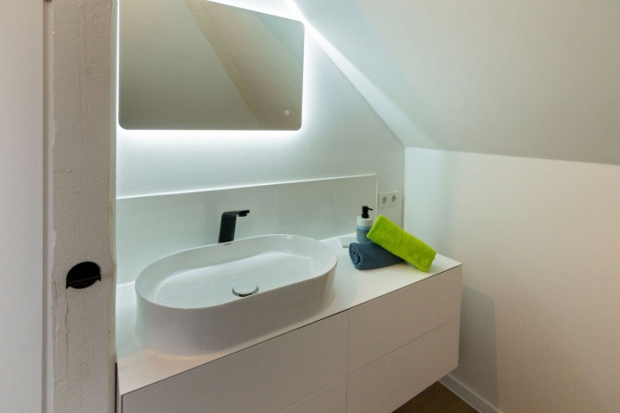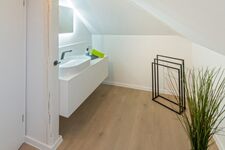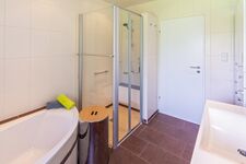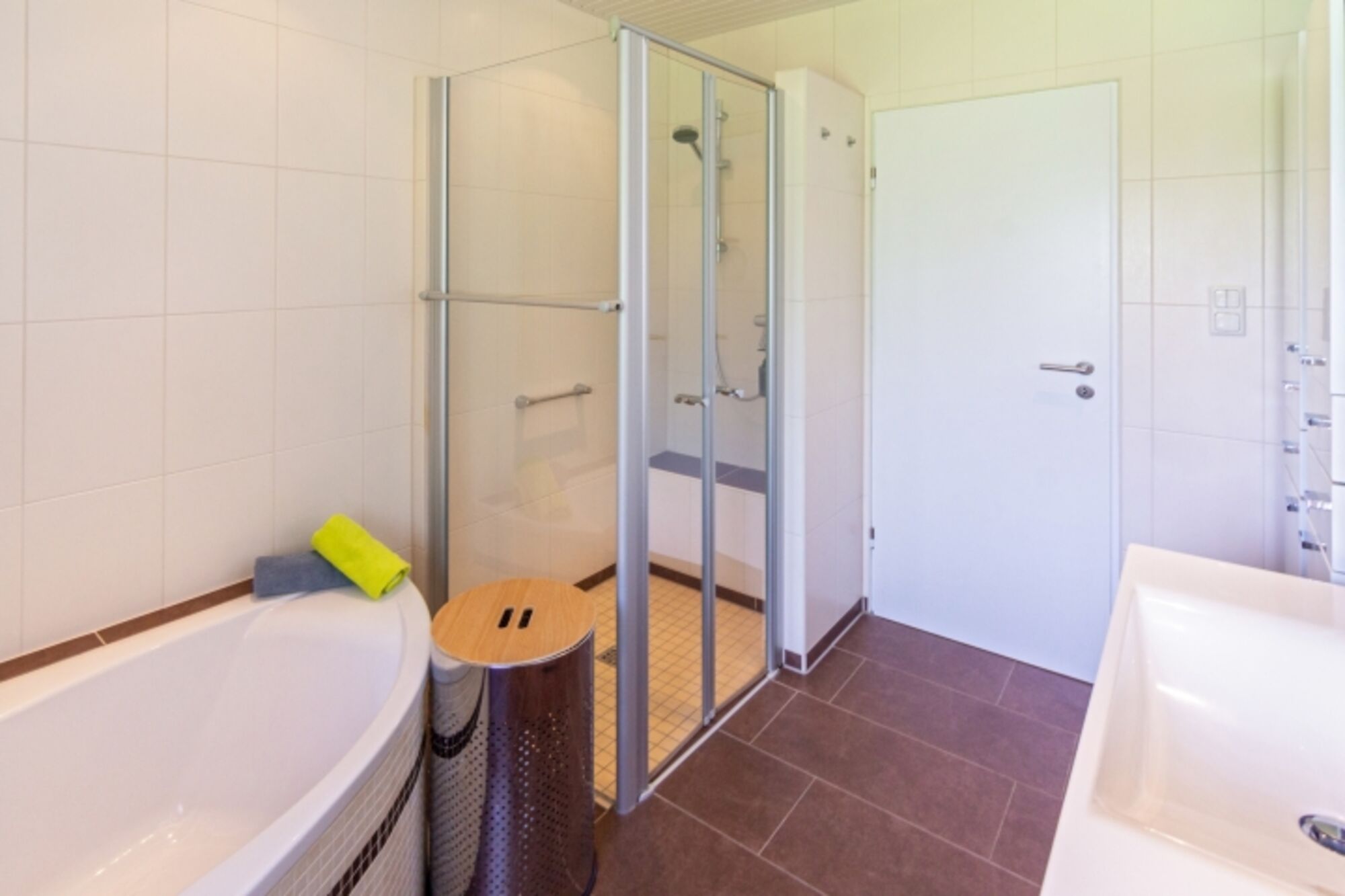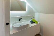Im modern ausgestatteten Badezimmer können Sie nach einem aufregenden Urlaubstag in der Badewanne ein Entspannungsbad nehmen. Zusätzlich ist im Badezimmer noch eine Dusche (ebenerdig), ein WC, ein Waschbecken, ein großer Spiegelschrank und ein Kosmetikspiegel vorhanden.