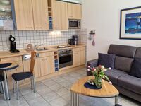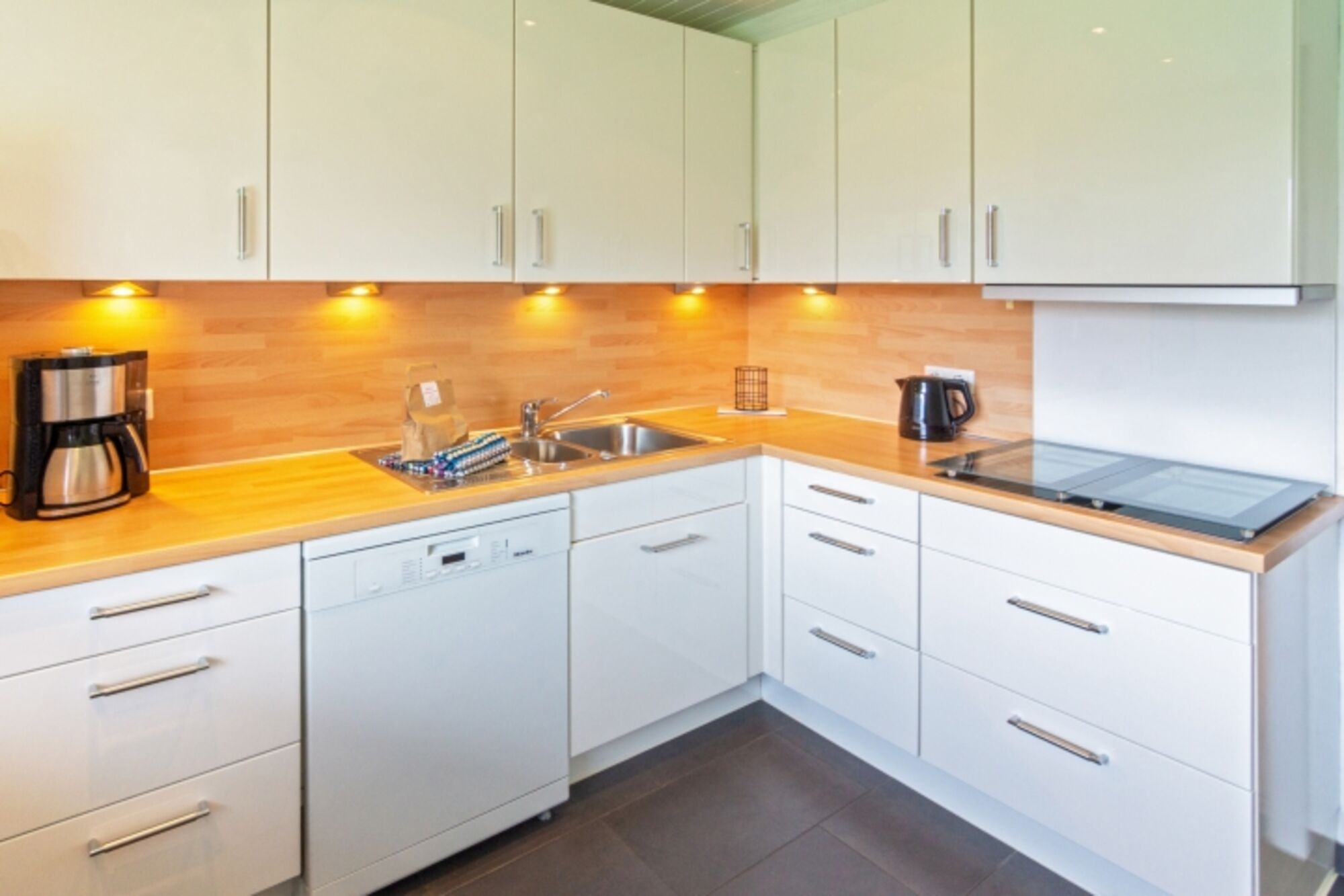 Vom Esszimmer gelangen Sie in die Küche mit moderner Küchenzeile. Diese ist mit Ceranfeld, Backofen, Mikrowelle, Kühlschrank mit Gefrierfach, Spülmaschine, Kaffeemaschine gut ausgestattet. Sie bietet alles, was Sie für Ihr perfektes Nordsee-Dinner benötigen.