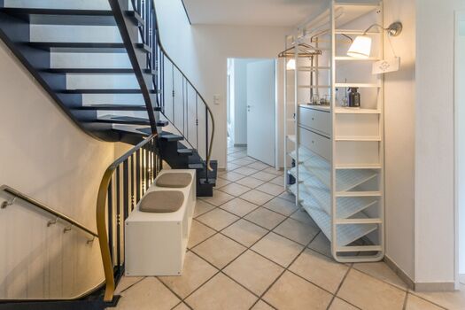 Im Flur befindet sich eine weitere Kommode, ein Schuhregal und eine Gadrobe.