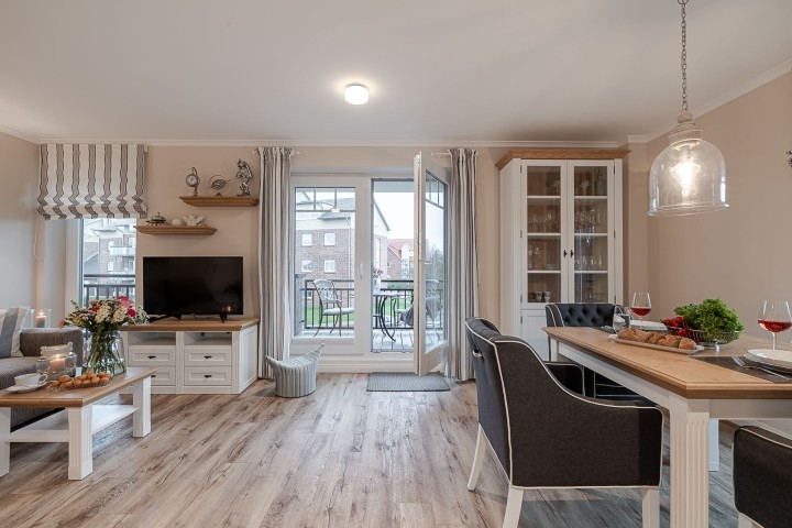 Ein besonderes Highlight ist der sonnige Westbalkon, der auch bei norddeutschem Wetter durch seine geschützte Lage oft zum Verweilen im Freien einlädt – ideal, um die frische Nordseeluft zu genießen.