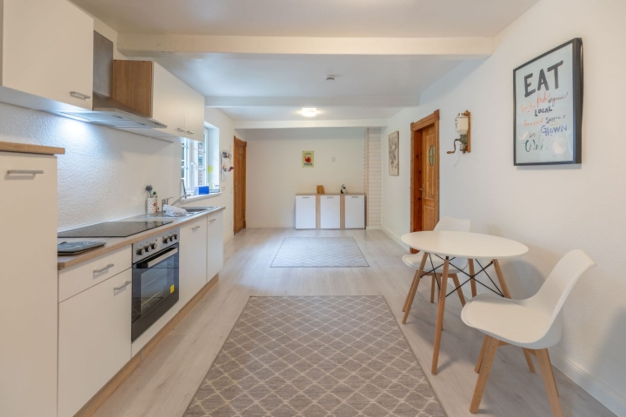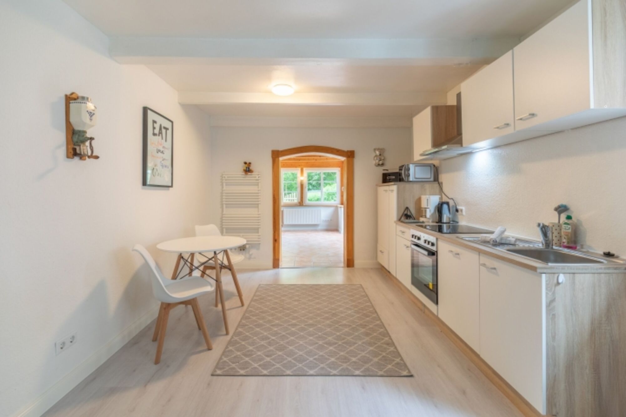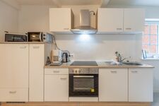 Cerankochfeld, Dunstabzugshaube, Gewürze (Salz, Pfeffer, Zucker), Geschirrhandtücher, Essplatz in der Küche