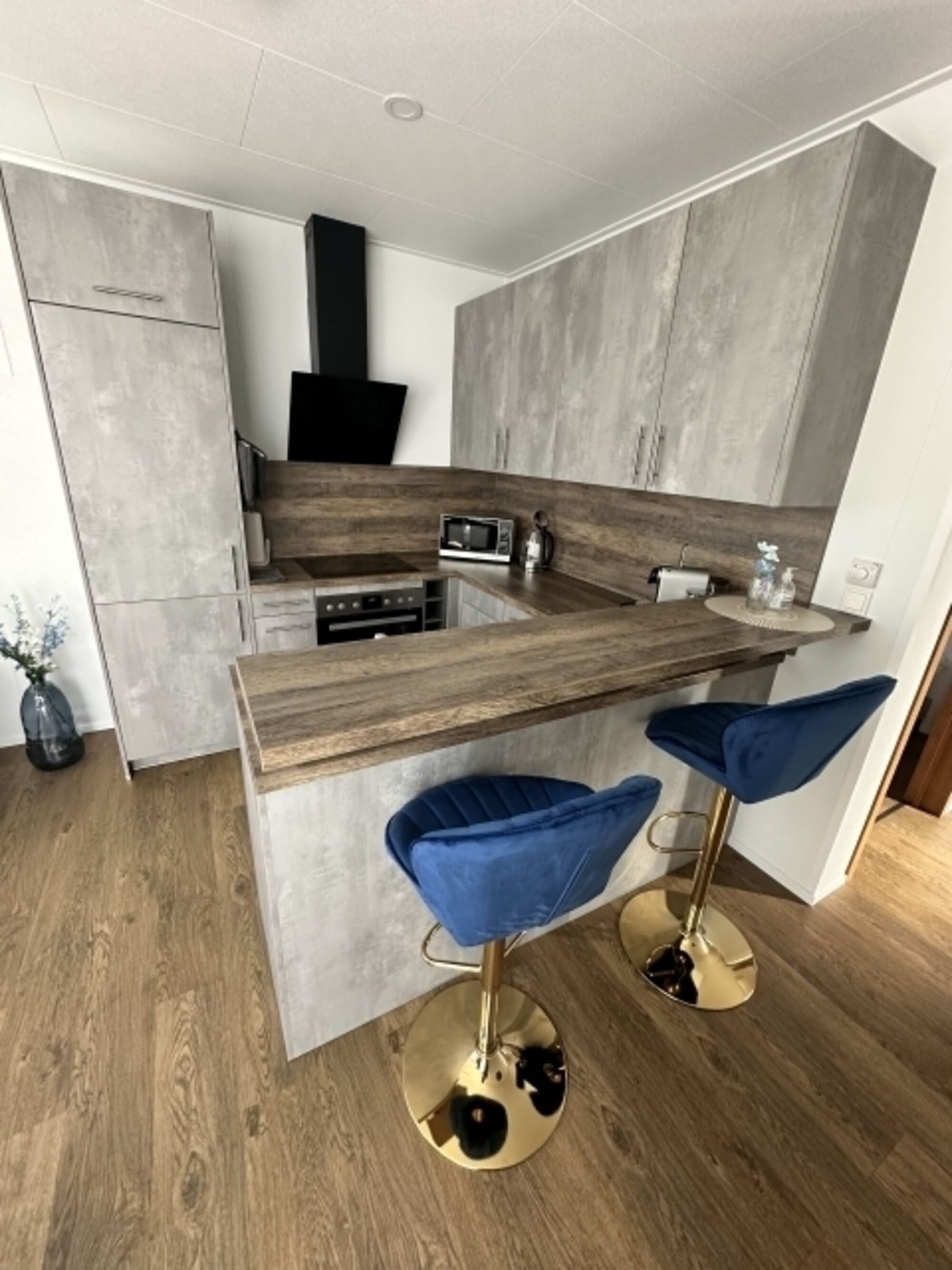 4-Platten Herd, Cerankochfeld, Induktionsherd, Kühlschrank mit Gefrierfach, Gefrierschrank, Senseo-Kaffeeautomat, Nespresso-Automat, Gewürze (Salz, Pfeffer, Zucker), Öl / Essig, Geschirrhandtücher, Mülltüten, Essplatz in der Küche, TV in der Küche