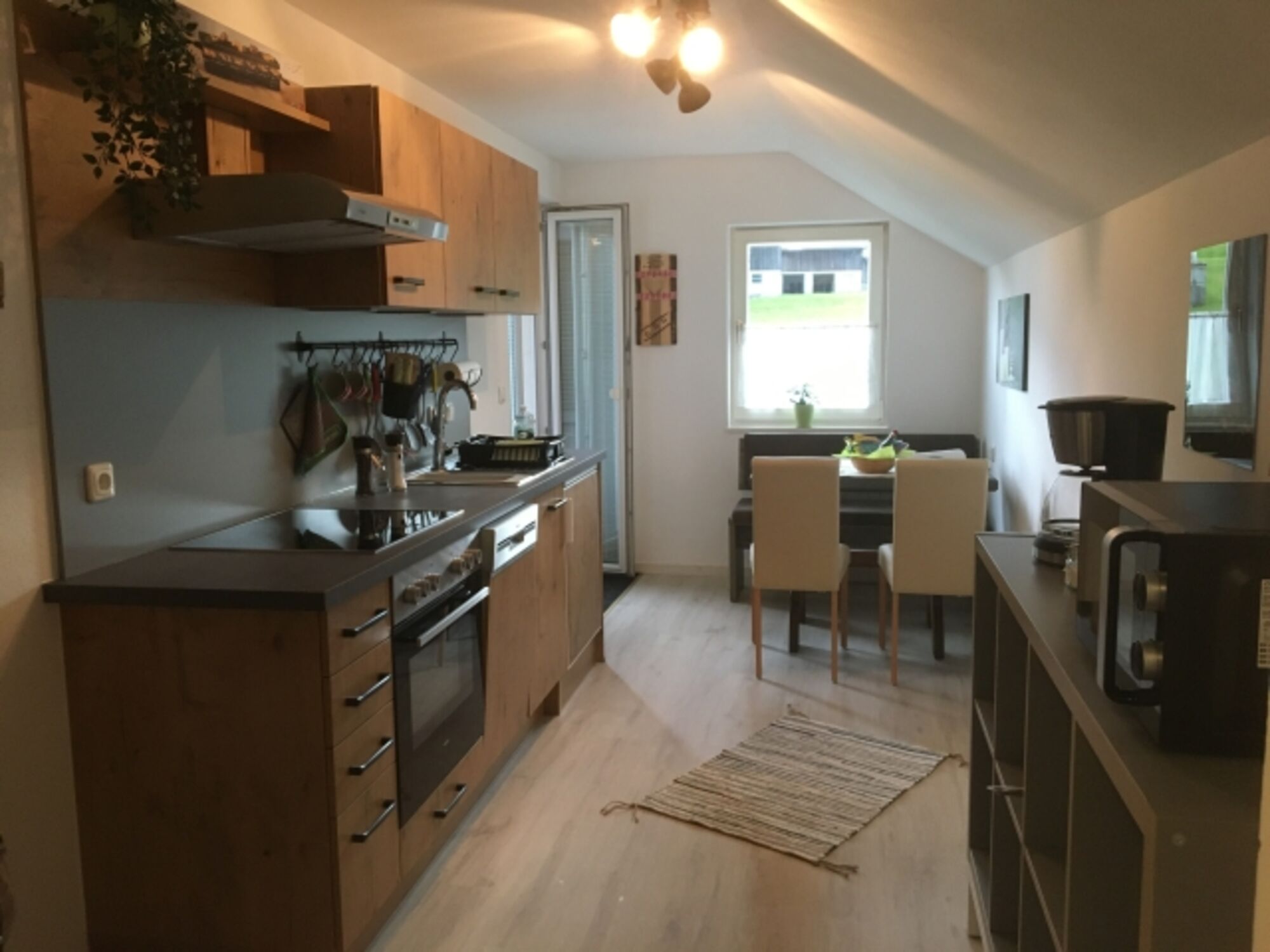 Die gemütliche Sitzgelegenheit mit Bank und gepolsterten Stühlen lädt zum Verweilen ein. Von der Küche betritt man den Balkon mit traumhaften Blick auf die Ausläufer des Dachsteingebirges auf der Südseite.