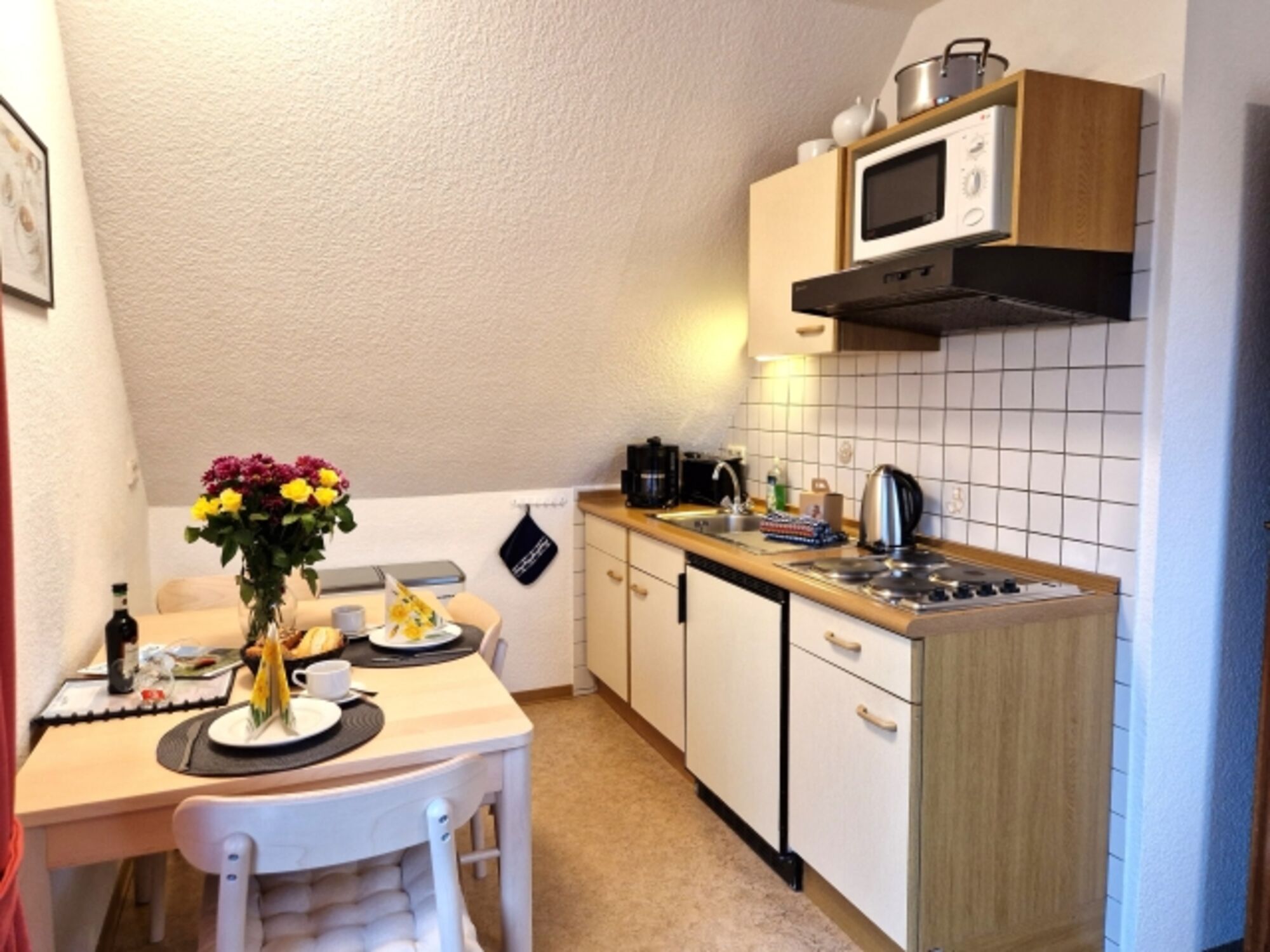 Ferner sind ein Toaster, Wasserkocher und eine Kaffeemaschine vorhanden.