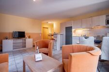 - Heller Wohn- und Essbereich mit Küchenzeile, Flachbild-TV und ausziehbarer Schlafcouch