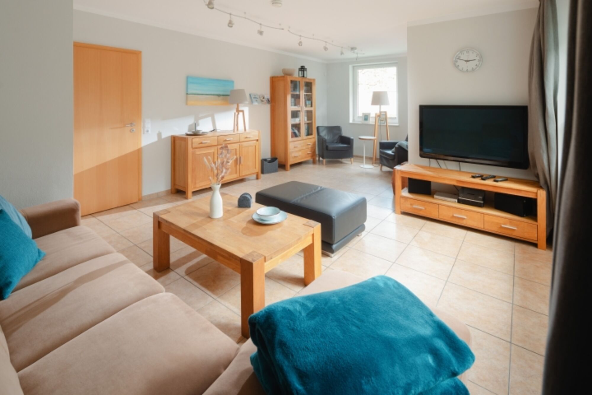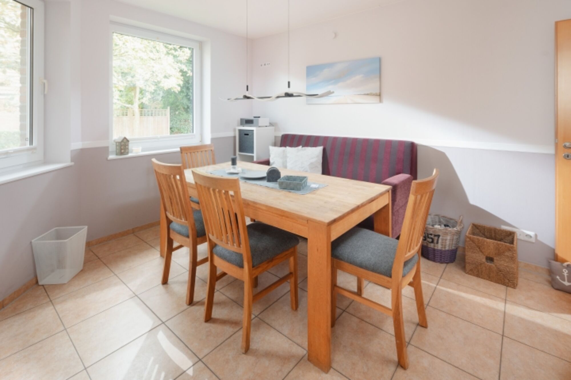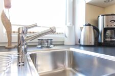 Die Südterrasse ist mit modernen Gartenliegen mit Auflagen, einem großen Tisch mit 6 Stühlen, einem Strandkorb und einem Sonnenschirm ausgestattet. Die komplette Wohnung verfügt über eine Fußbodenheizung sowie einem 46" Flachbildschirm im Wohnzimmer und einem kleineren im Schlafzimmer. Eine Waschmaschine ( gegen Gebühr ), Trockner, Bügelbrett mit Bügeleisen, Handstaubsauger, einen Bollerwagen, Strandspielzeug, sowie Kinderbett, Hochstuhl und Babyfon stehen kostenlos zur Verfügung. Diese Wohnung hat ein Duschbad mit separater Dusche und Badewanne, sowie einem separaten Gäste-WC. Das Badezimmer verfügt über einen Handtuchhalter als Heizung und einem großen Fenster.