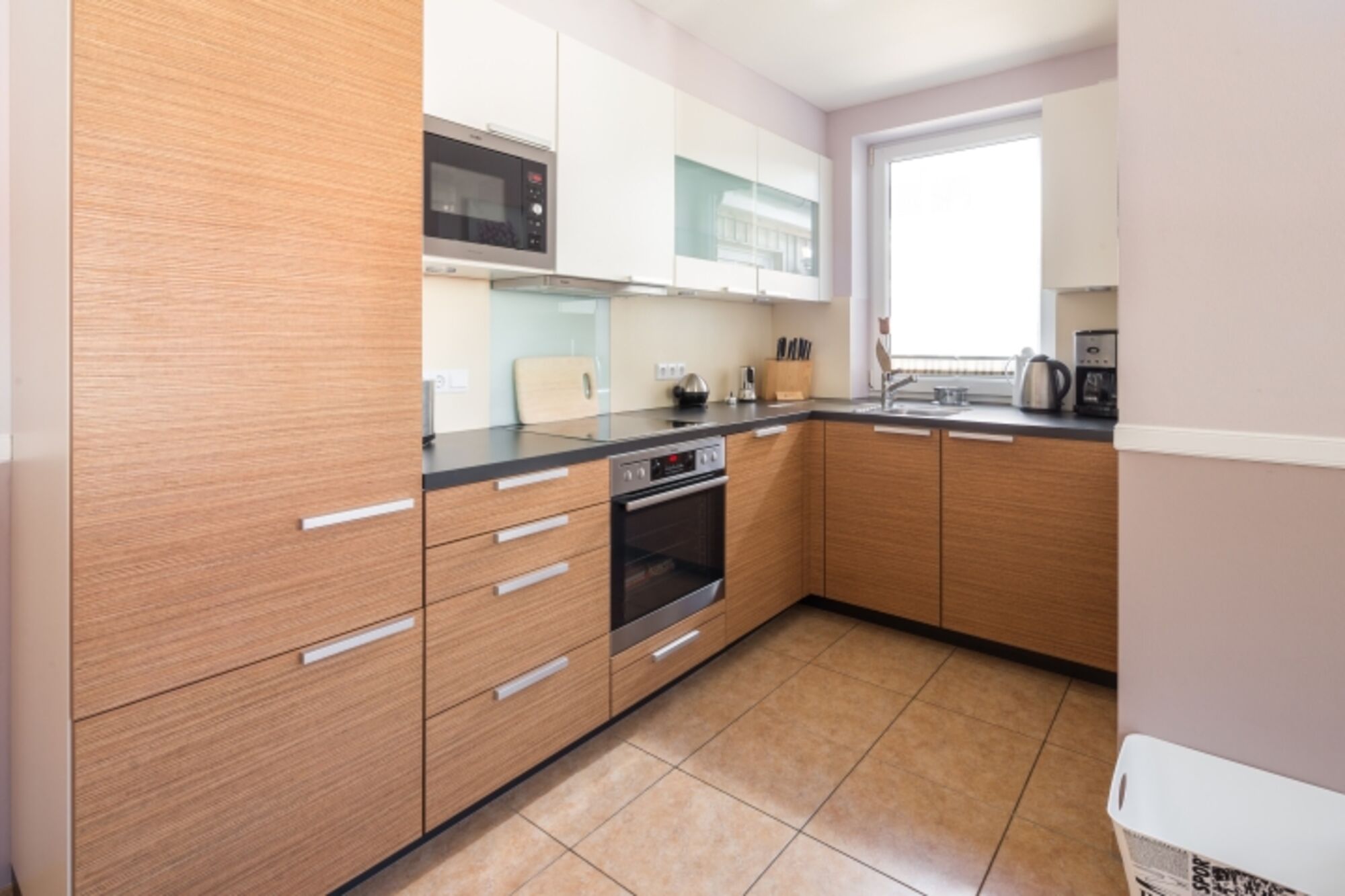 Cerankochfeld, Dunstabzugshaube, Kühlschrank mit Gefrierfach, Eierkocher, Mixer, Elekt. Fruchtpresse, Korkenzieher / Flaschenöffner, Gewürze (Salz, Pfeffer, Zucker), Öl / Essig, Geschirrhandtücher, Mülltüten, Essplatz in der Küche