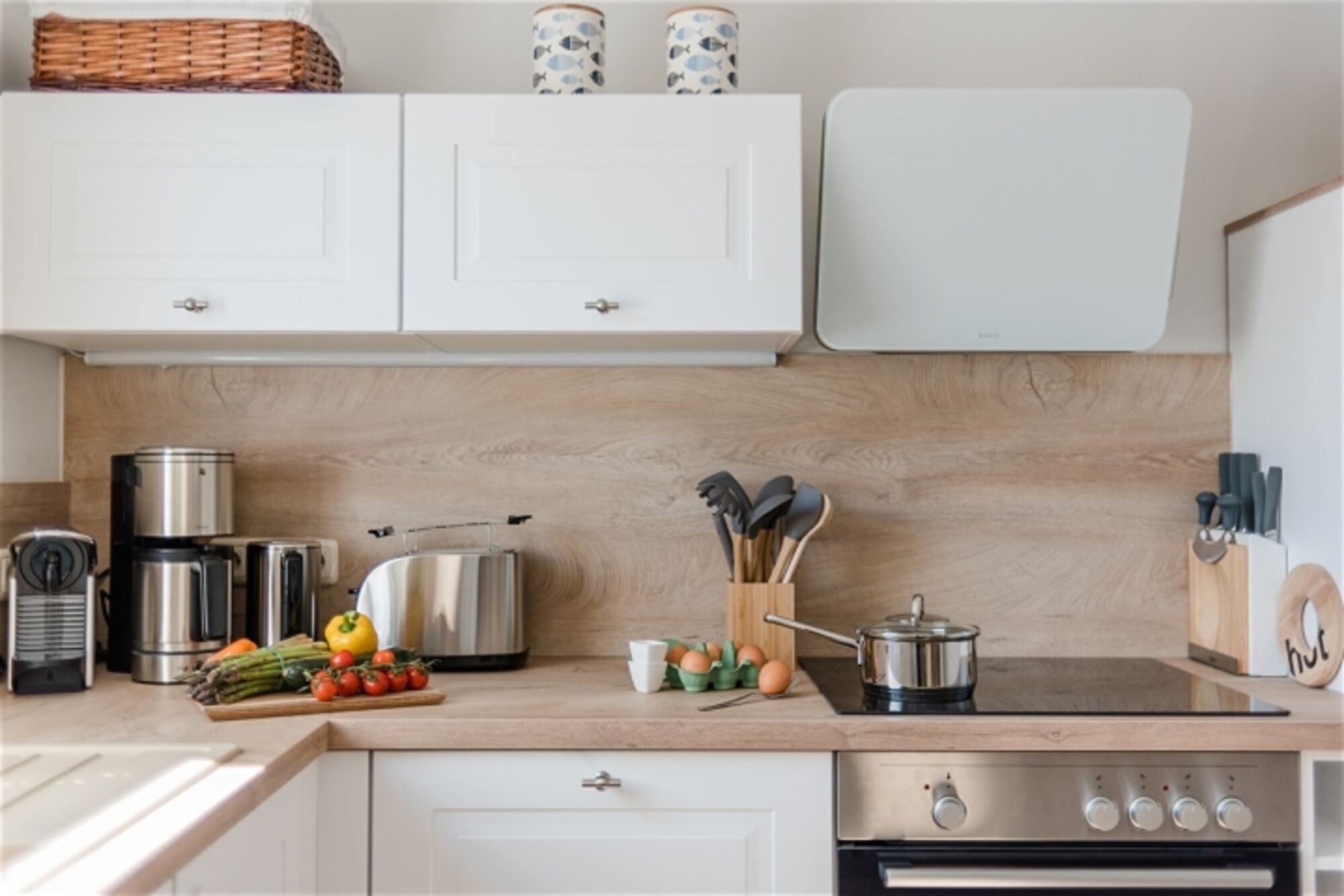 4-Platten Herd, Cerankochfeld, Dunstabzugshaube, Kühlschrank mit Gefrierfach, Nespresso-Automat, Eierkocher, Küchenmaschine, Mixer, Korkenzieher / Flaschenöffner, Öl / Essig, Essplatz in der Küche