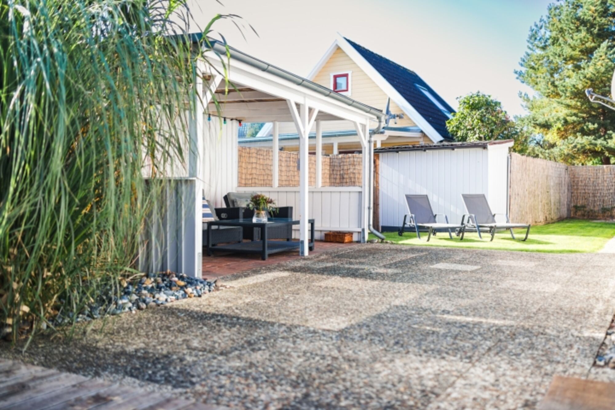 Sonniger Garten mit Süd-Westterrasse: Entspannen Sie auf der Terrasse, lauschen Sie dem Meeresrauschen und genießen Sie die Sonne.