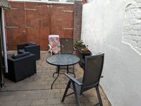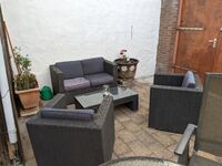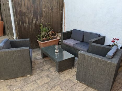 Durch einen Vorraum, in dem ein Schlafsofa steht, gelangt man in den abgeschlossenen Innenhof. Dort stehen Gartenmöbel zum Sonnen.