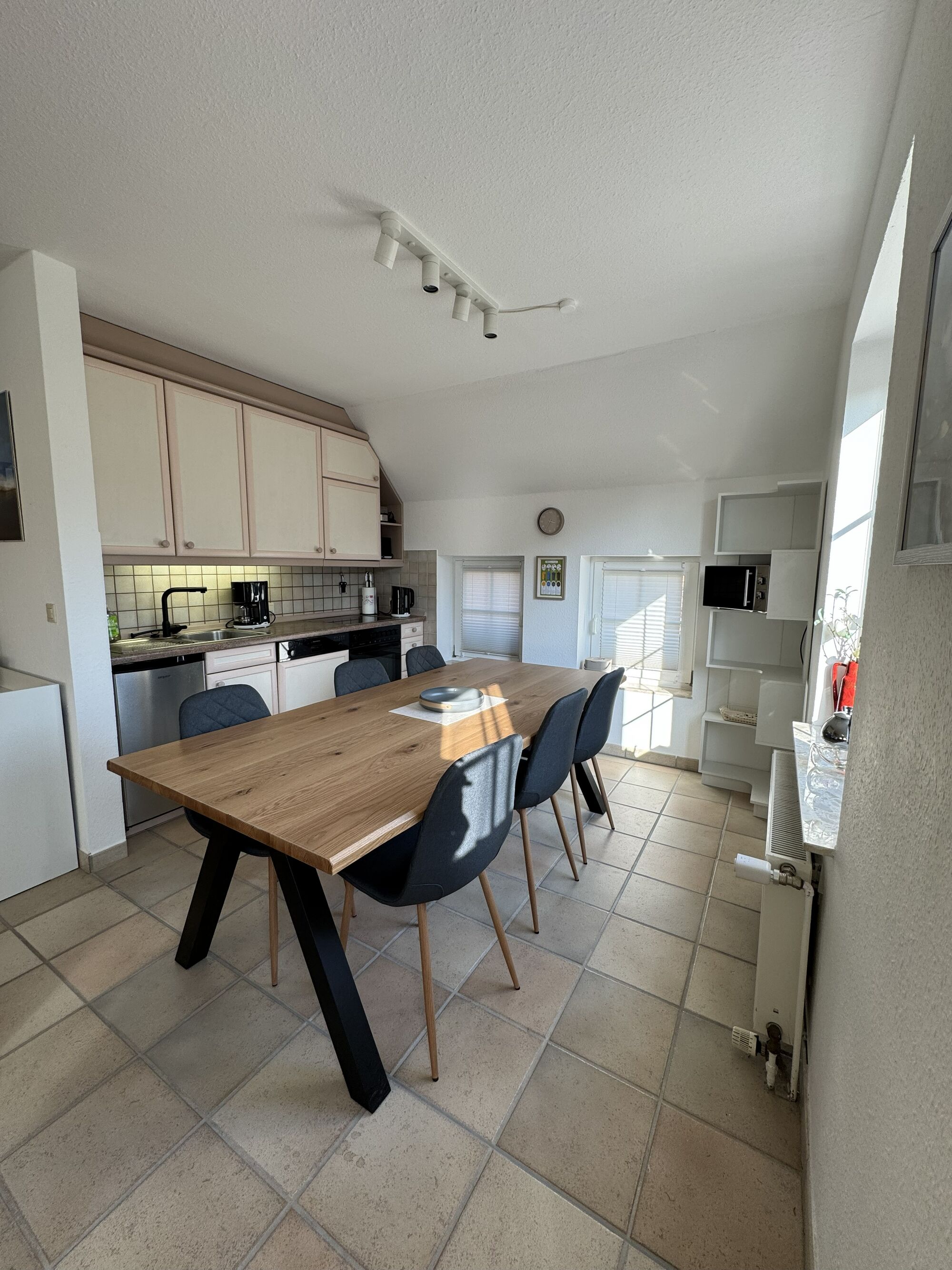 Die Küche ist offen in den Wohnbereich integriert und vollständig ausgestattet. Alle wichtigen Küchengeräte und Utensilien sind vorhanden. Kurze Wege und eine klare Anordnung erleichtern die Nutzung.