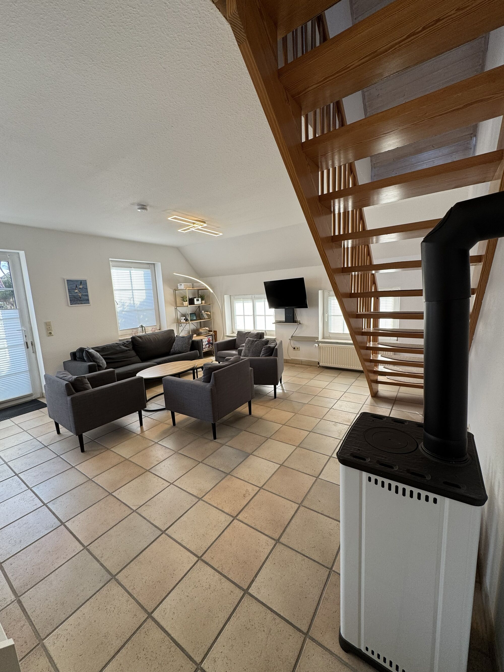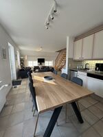 Der Wohn- und Essbereich ist offen gestaltet. Wohnbereich, Essbereich und Küche gehen fließend ineinander über. Ein Kaminofen sorgt besonders in der kühleren Jahreszeit für eine angenehme Atmosphäre. Von hier aus haben Sie direkten Zugang zur Terrasse und in den Garten.