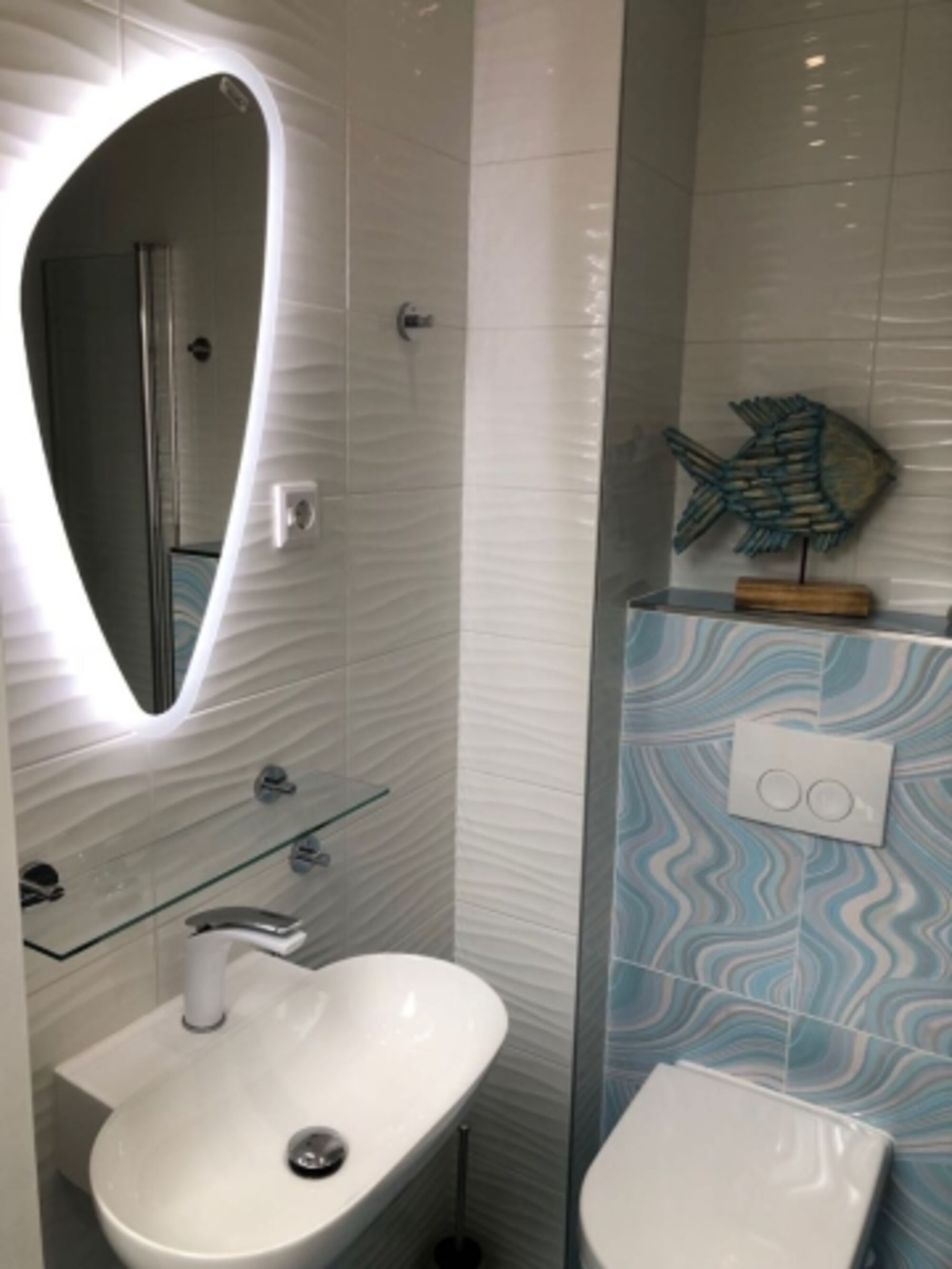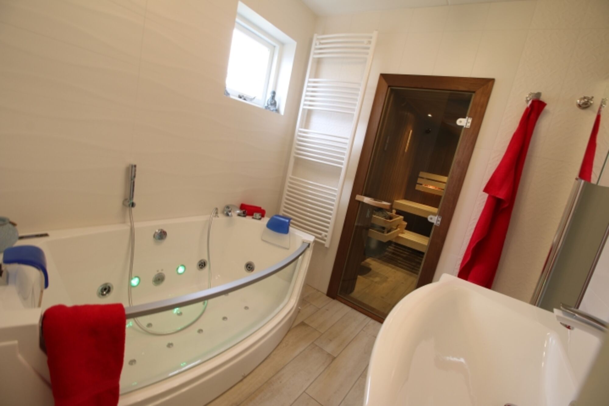 Das schön gestaltete Bad ist ausgestattet mit modernen Badmöbeln, einer Whirlpoolbadewanne, einem Handtuchheizkörper und einer ebenerdigen Regendusche mit Sunshower/Solarium.