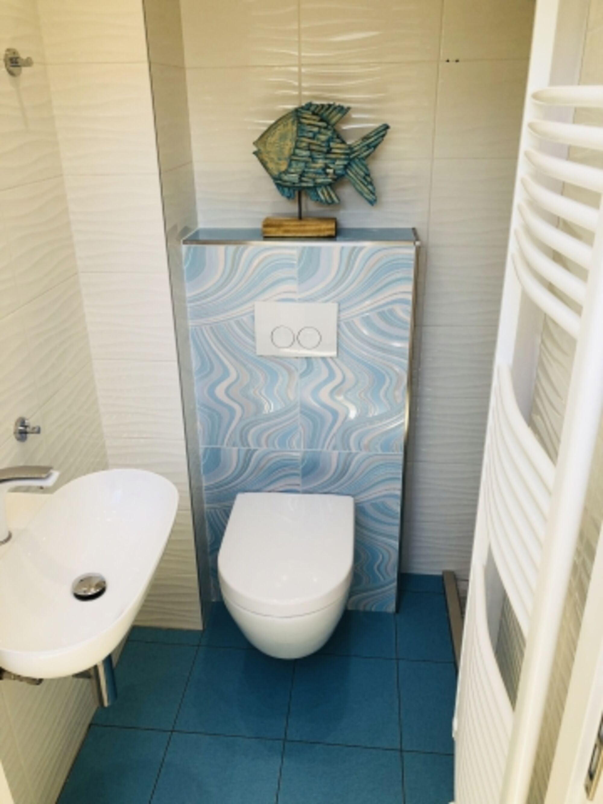 Das Bad im OG verfügt über eine Dusche, Waschbecken und Toilette, sowie einem Handtuchheizkörper.