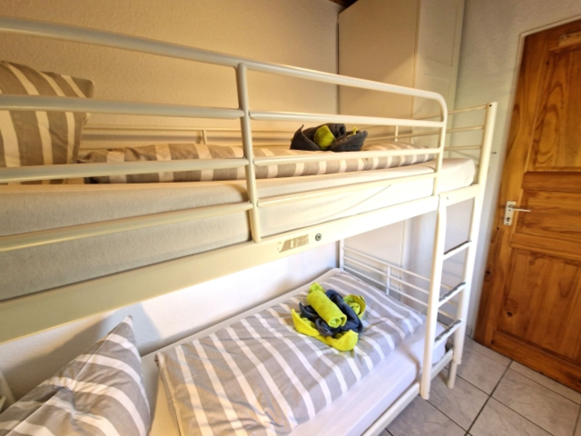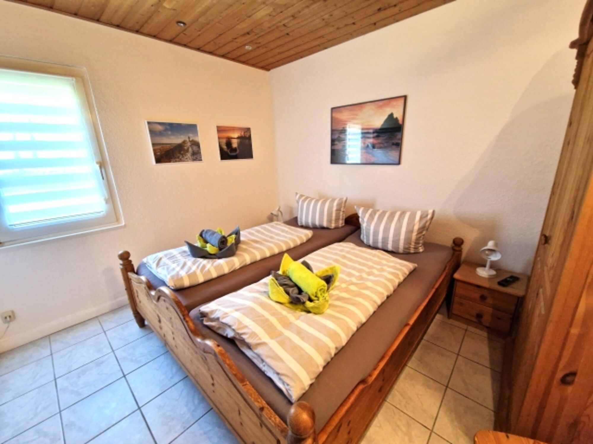 In den Schlafräumen finden Sie Ruhe und Entspannung. Es stört kein Straßenverkehrslärm, da das Haus in einer ruhigen parkähnlichen Gartenanlage ohne Durchgangsverkehr liegt. Außerdem befindet sich im Schlafzimmer ein zweiter Flachbildschirm, so dass Sie getrennt verschiedene Programme sehen können. Ferner verfügt der Ferienbungalow über 2 weitere Schlafzimmer 1x Einzelbett und 1x Etagenbett)