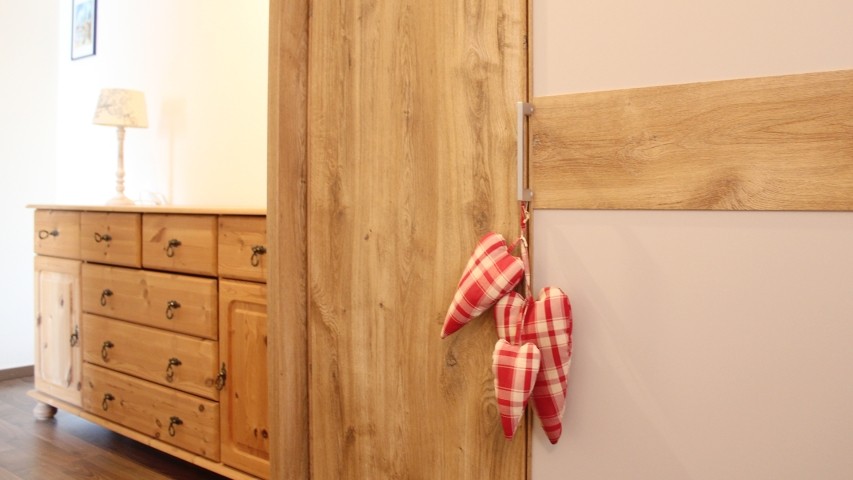 Das helle Hauptschlafzimmer lädt mit einem gemütlichen Doppelbett, TV und großem Kleiderschrank zum Träumen ein. Über einen gemeinsamen Eingang gelangen Sie in das kleine Schlafzimmer mit Doppelbett – perfekt für kleine und größere Abenteurer.