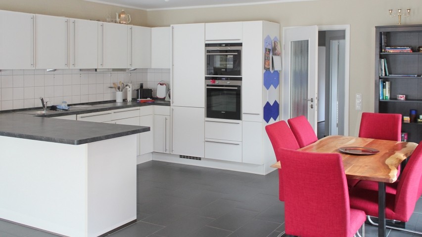Die offene Wohnküche ist voll ausgestattet mit Induktionsherd, Backofen, Geschirrspüler, Kühlschrank, Gefrierschrank und einer Pad-Kaffeemaschine für den perfekten Start in den Tag. Am großen Esstisch finden bis zu sechs Personen bequem Platz für gemeinsame Mahlzeiten und Spieleabende.