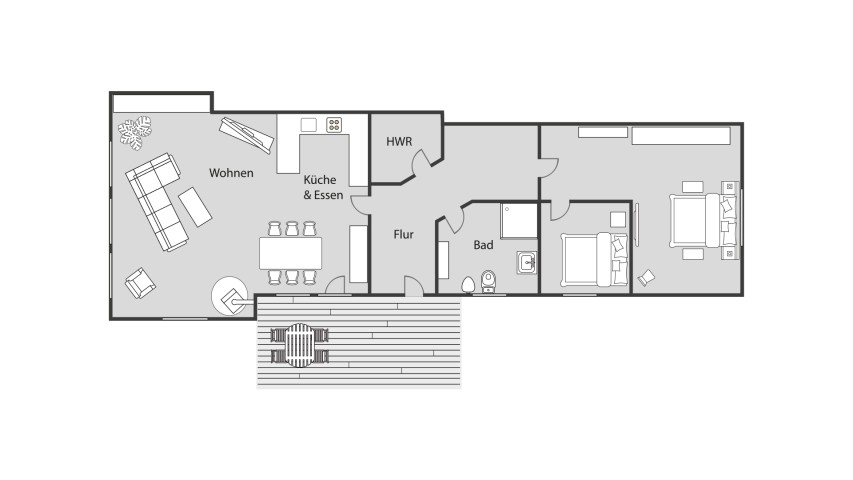 Im lichtdurchfluteten Wohnbereich erwarten Sie ein Relax-Sessel, eine gemütliche Sitzgarnitur, ein Kaminofen für knisternde Abende und ein TV für Film- oder Serienmomente. Ihren Stick zum Streamen von Netflix & Co. können Sie gern mitbringen und via HDMI Anschluss nutzen. Die Sitzgarnitur kann bei Bedarf als Gästebett für bis zu zwei weitere Personen verwendet werden.
