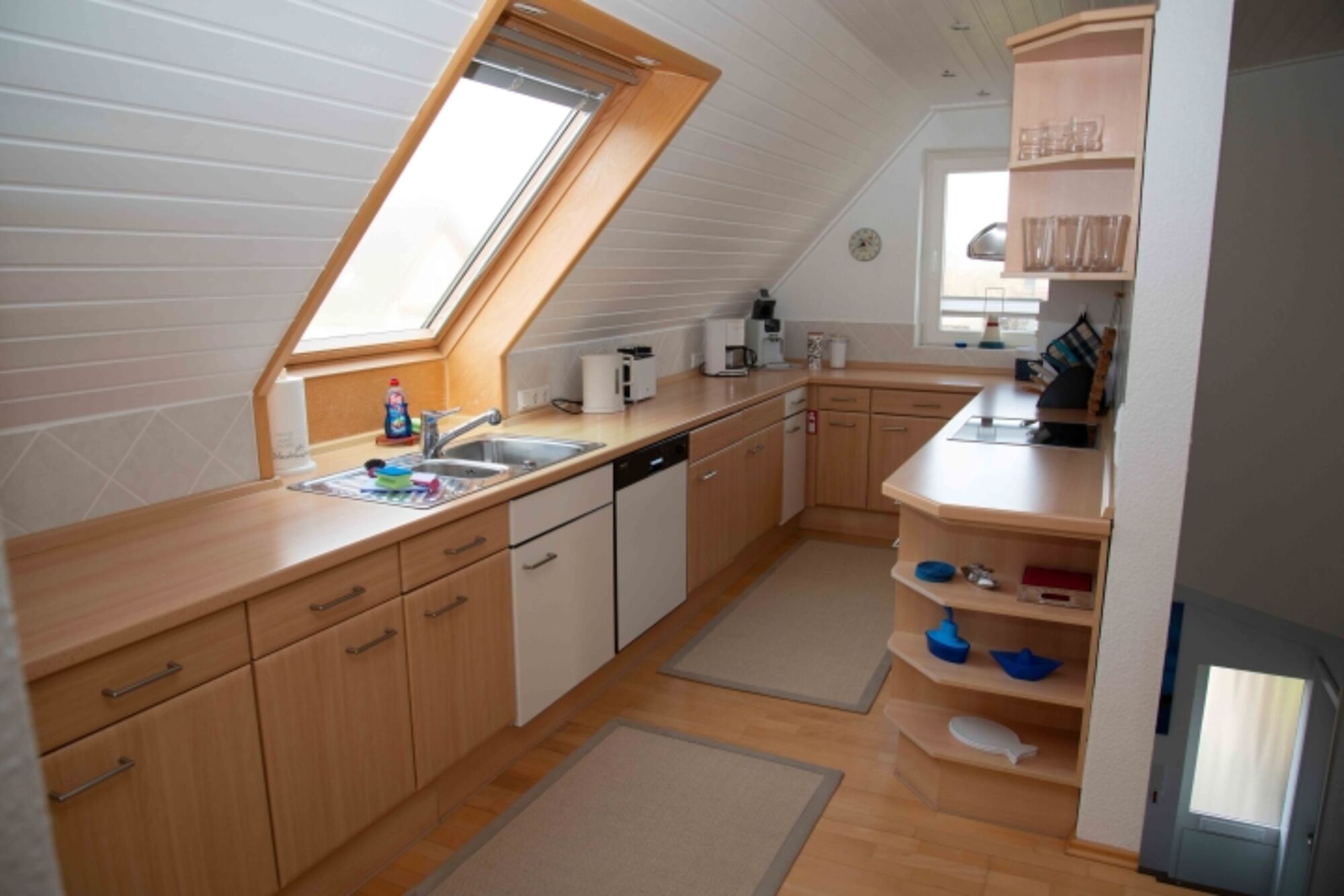 4-Platten Herd, Cerankochfeld, Dunstabzugshaube, Kühlschrank mit Gefrierfach, Senseo-Kaffeeautomat, Eierkocher, Waffeleisen, Korkenzieher / Flaschenöffner, Gewürze (Salz, Pfeffer, Zucker), Geschirrhandtücher, Mülltüten, Essplatz in der Küche