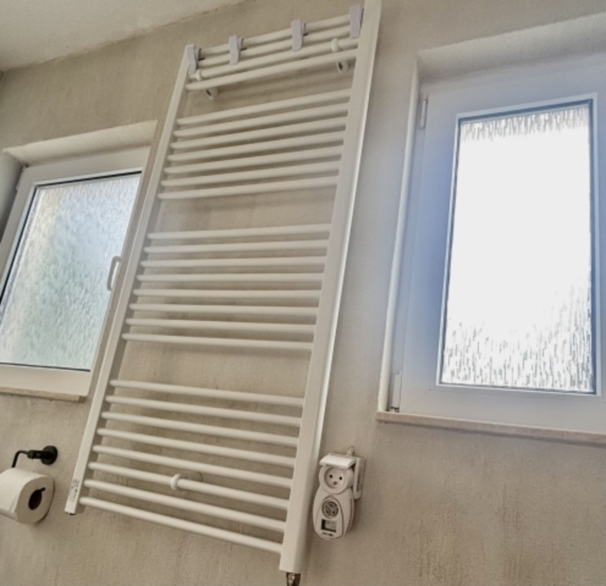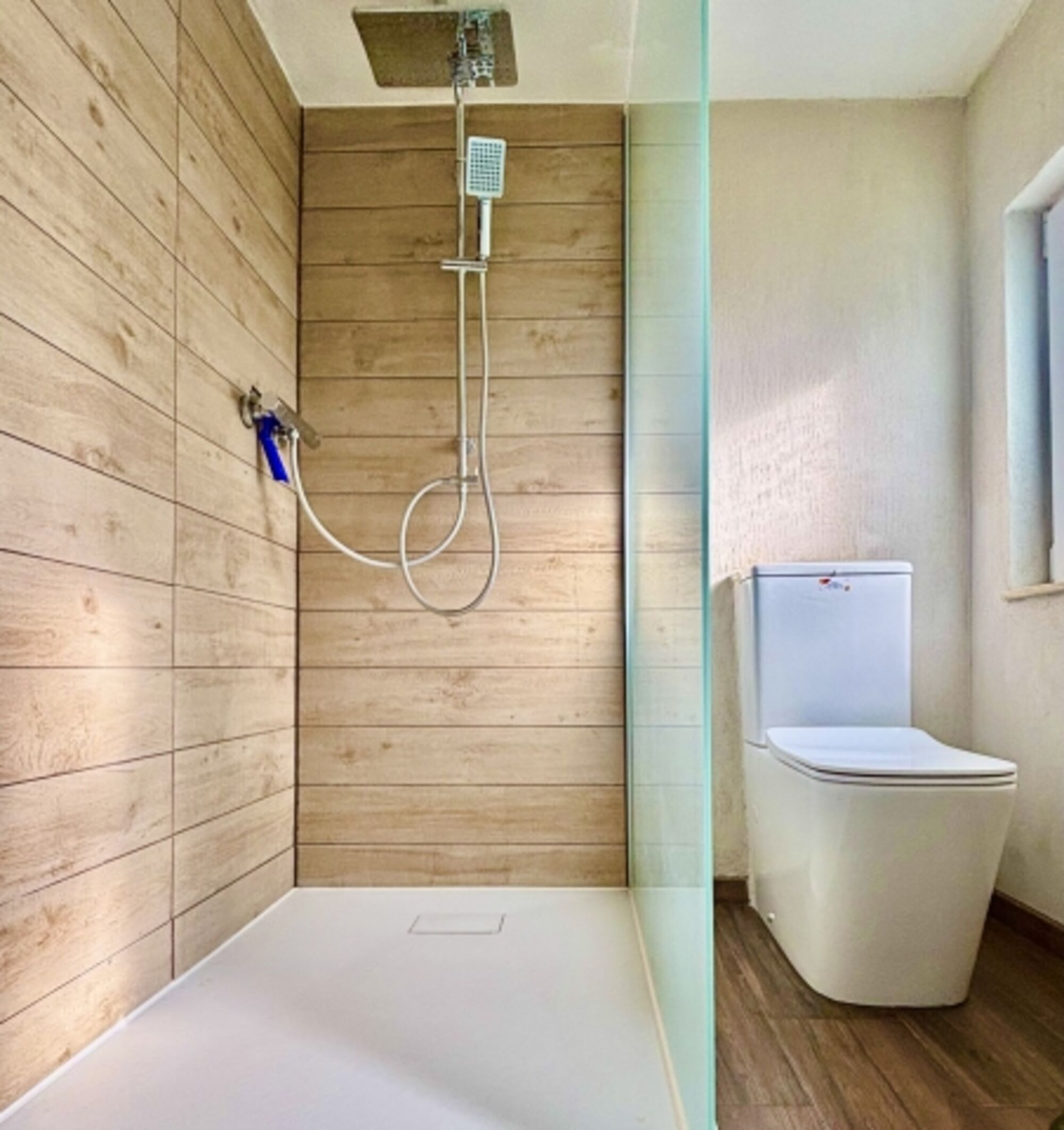 Das Bad wurde erst Anfang 2025 renoviert. Waschbecken, Regendusche, Spiegel, Fenster im Bad, Fliegengitter